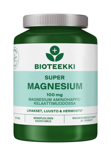 MaidotonBioteekki Super Magnesium on ainutlaatuisen tehokas ja nopeavaikutteinen magnesiumvalmiste. Super Magnesiumissa magnesium on heti valmiina imeytyvässä aminohappokelatoidussa muodossa, minkä ansiosta se imeytyy nopeasti ja tehokkaasti. Magnesium edistää hermoston ja lihasten normaaleja toimintoja ja auttaa siten palautumaan päivän koitoksista. Magnesium edistää myös normaaleja psykologisia toimintoja, joiden toiminta on tärkeä rauhoittumisessa.