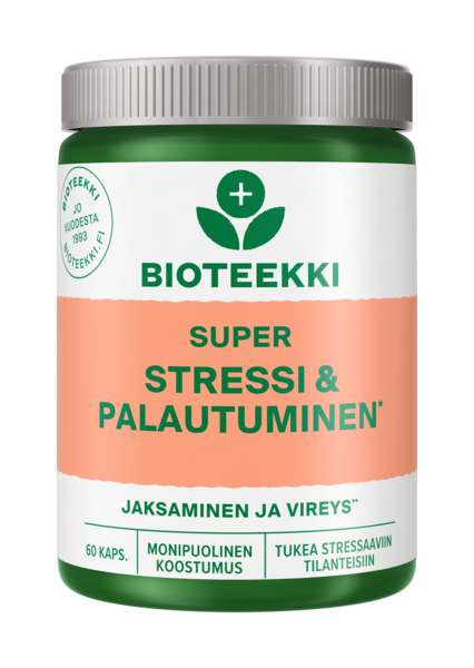 MaidotonBioteekki Super Stressi & Palautuminen on ainutlaatuinen ravintolisä antamaan tukea henkisen ja fyysisen stressin aikana sekä auttamaan stressistä palautumisessa. Se sisältää kolmea tunnettua adaptogeeniä: venäjänjuurta, joka tukee palautumista ja kognitiivisia toimintoja, ruusujuurta, joka tukee elimistön sopeutumista stressaavissa tilanteissa sekä balsamiköynnöstä. Lisäksi valmisteen sisältämät C -vitamiini ja pantoneenihappo (B5) auttavat vähentämään väsymystä ja uupumusta.