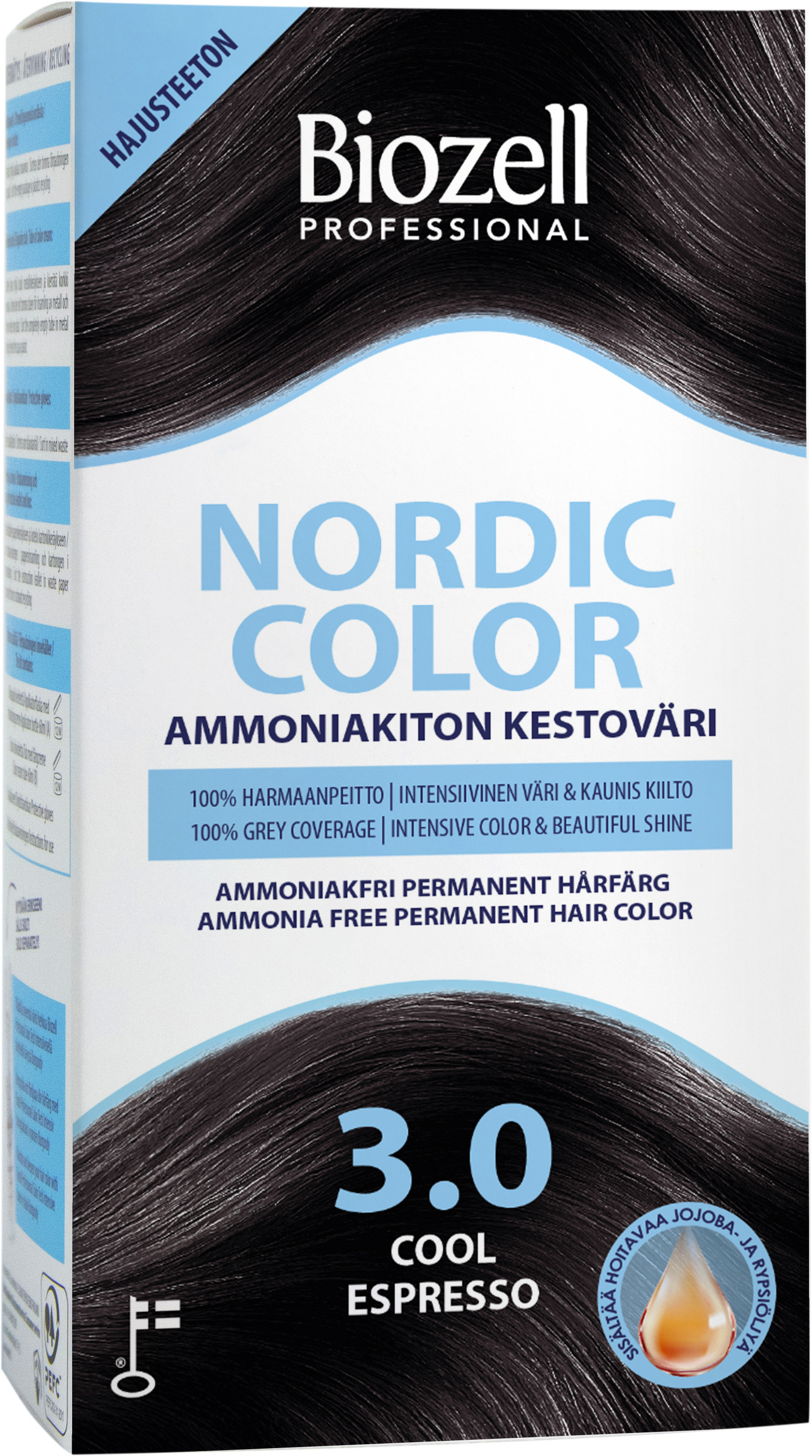 Nordic Color -värit sisältävät rypsi- ja jojobaöljyjä, jotka kosteuttavat hiusta ja hiuspohjaa sekä auttavat hiusväriaineita tunkeutumaan syvemmälle hiuskuituun, jolloin värinkesto paranee. Vegaaninen. Täyteläinen tummaruskea. Valmistettu Suomessa.