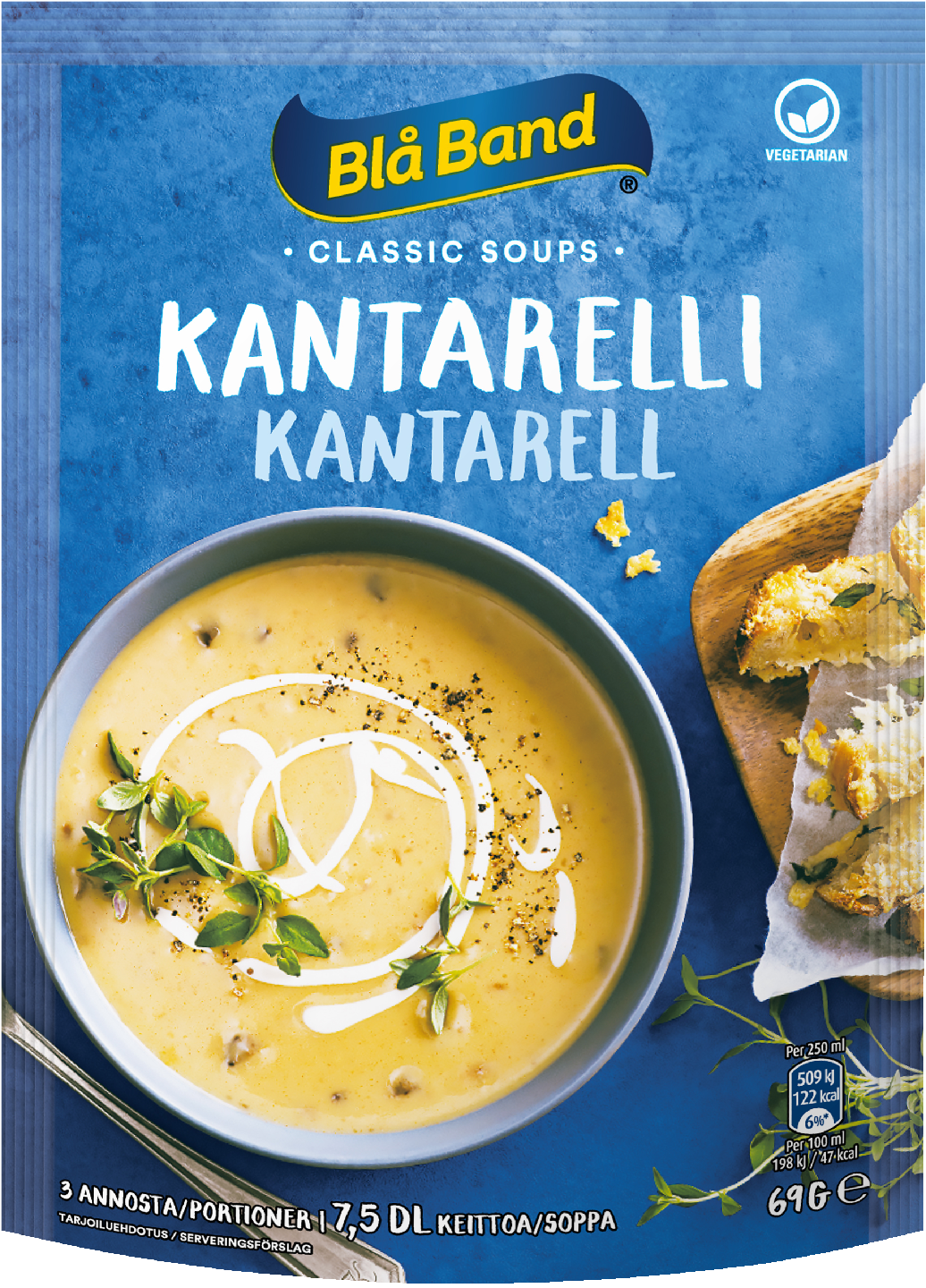Kermainen keitto, jossa on kantarellin maku. Kasvisvaihtoehto, joka sopii hyvin, kun haluat jotain lämmintä ja herkullista lounaaksi, illalliseksi tai välipalaksi. Viimeistelyyn: Timjamia, pippuria & kermaviiliä Tarjoile lisäksi: Paahdettua parmesaanitoastia. Valmistus: Kaada pussin sisältö kattilaan. Lisää 6 dl kylmää vettä ja sekoita. Kuumenna. Anna kiehua miedolla lämmöllä haluttuun koostumukseen, samalla sekoittaen, noin 5 min. Lisää 1,5 dl maitoa ja kuumenna. Tarjoa.
