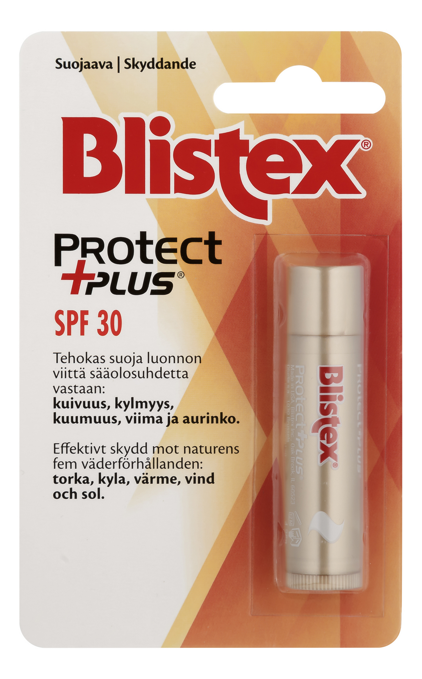 Blistex Protect Plus on tehokas sääsuoja, joka suojaa huulet luonnon kaikilta 5:ltä sääolosuhteelta. Kuivuus: Vehnänalkioöljy kosteuttaa Kylmyys: Kehäkukkaöljy rauhoittaa Kuumuus: Glyseriini palauttaa kosteustasapainon Viima: Candelillaöljy muodostaa viimalta suojaavan pinnan Aurinko: Korkea 30 suojakerroin suojaa huulet auringon haitallisilta UVA/UVB-säteiltä.