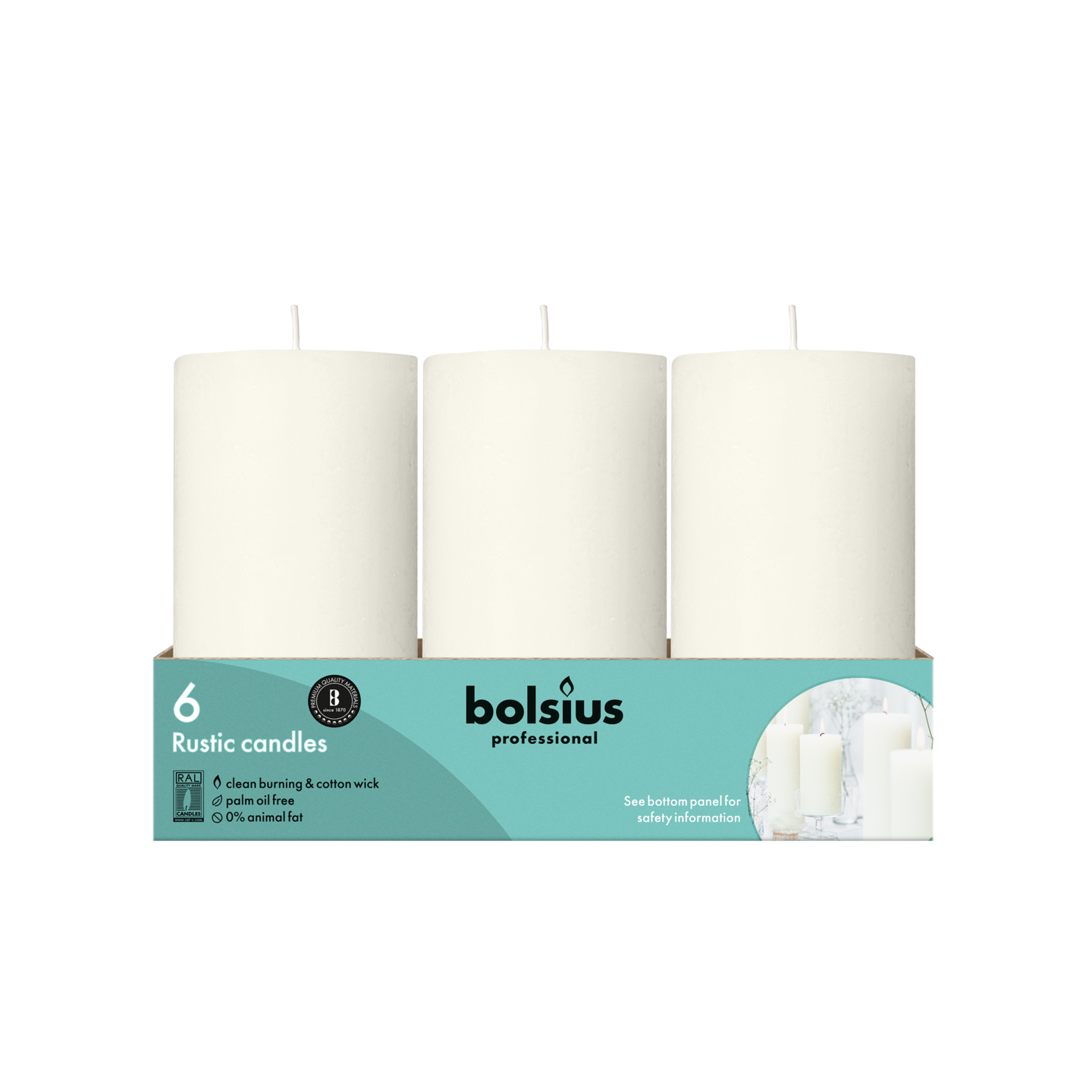 Kynttilöiden luonnollinen valo luo lämpöä ja tunnelmaa pöydällä. Rustiikkinen norsunluun valkoinen Bolsius Professional -pilarikynttilä on 13 cm korkea ja palaa 60 tuntia. Se on valmistettu rakkaudesta ihmisiin ja planeettaan, ja se koostuu luonnollisesta vegaanisesta vahasta, mutta ei sisällä palmuöljyä. Bolsius Professional -kokoelmasta löydät erikokoisia ja -värisiä rustiikkisia kynttilöitä, joita voit yhdistellä helposti.