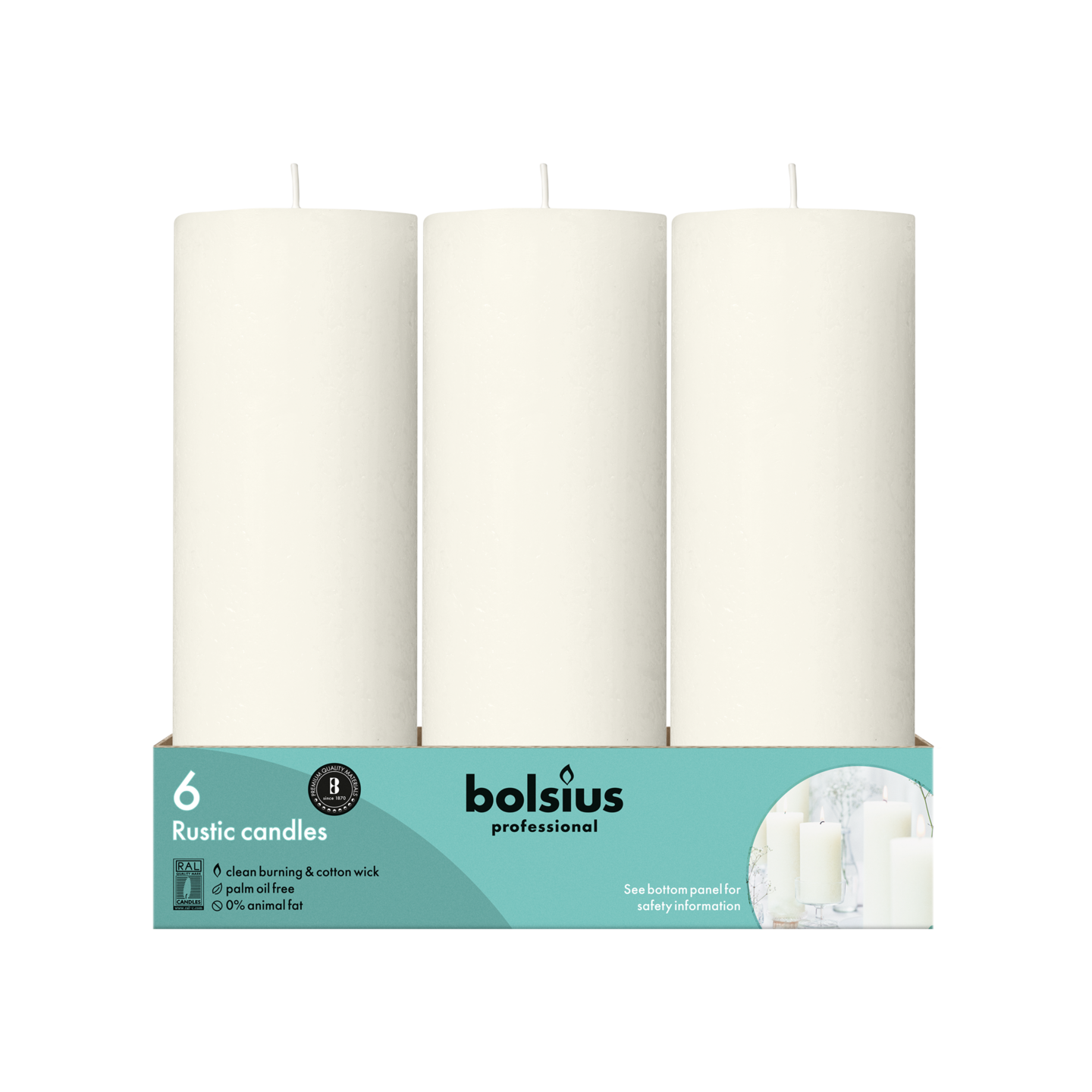 Kynttilöiden luonnollinen valo luo lämpöä ja tunnelmaa pöydällä. Rustiikkinen norsunluun valkoinen Bolsius Professional -pilarikynttilä on 19 cm korkea ja palaa 85 tuntia. Se on valmistettu rakkaudesta ihmisiin ja planeettaan, ja se koostuu luonnollisesta vegaanisesta vahasta, mutta ei sisällä palmuöljyä. Bolsius Professional -kokoelmasta löydät erikokoisia ja -värisiä rustiikkisia kynttilöitä, joita voit yhdistellä helposti.