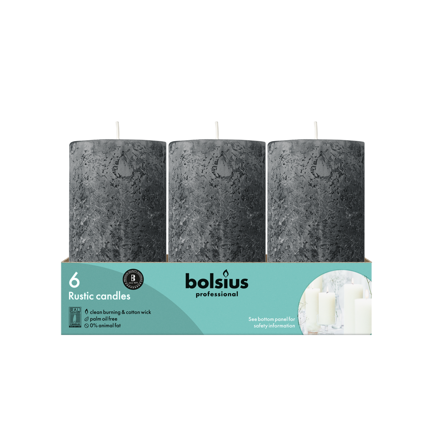 Kynttilöiden luonnollinen valo luo lämpöä ja tunnelmaa pöydällä. Rustiikkinen harmaa Bolsius Professional -pilarikynttilä on 13 cm korkea ja palaa 60 tuntia. Se on valmistettu rakkaudesta ihmisiin ja planeettaan, ja se koostuu luonnollisesta vegaanisesta vahasta, mutta ei sisällä palmuöljyä. Bolsius Professional -kokoelmasta löydät erikokoisia ja -värisiä rustiikkisia kynttilöitä, joita voit yhdistellä helposti.