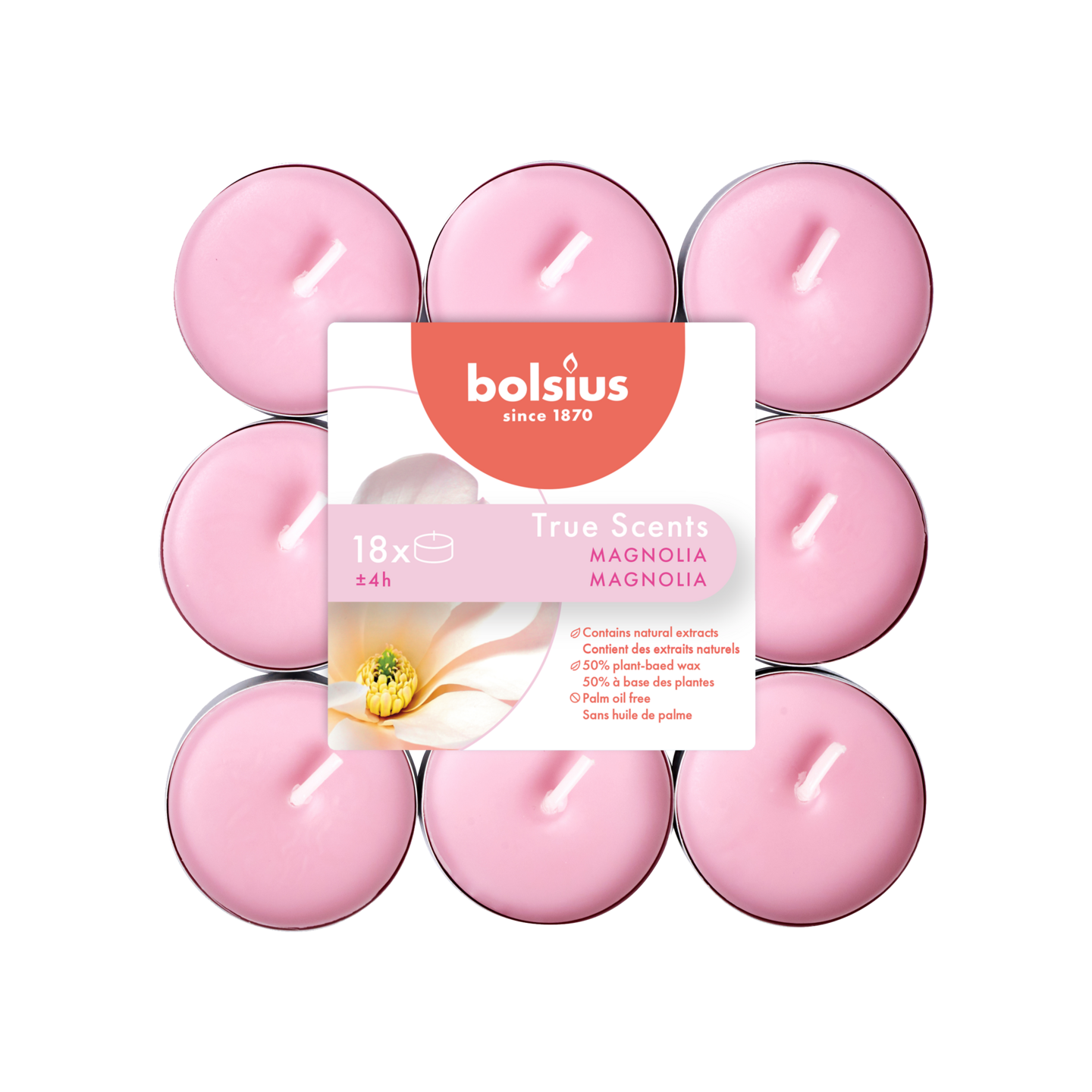 Nauti pitkäkestoisesta tuoksuelämyksestä Bolsius True Scents Magnolia -tuoksullisilla lämpökynttilöillä ja löydä vastapoimittujen valkoisten kukkien ja hienon myskin pehmeä tuoksu. Nämä lämpökynttilät takaavat puhtaimman tuoksun vapautumisen jopa 4 tunniksi, kiitos CleanScent-teknologiamme. Tämä teknologia yhdistää ainutlaatuisesti puhtaimman vahamme ja erityisesti kehitetyn puuvillasydämen, joka haihduttaa tuoksun optimaalisesti. Valmistettu ilman palmuöljyä, luonnonuutteilla ja kasvipohjaisella vahalla. True Scents -mallistomme tarjoaa useita tuotteita, joissa on trendikkäitä tuoksuja ja moderneja klassikoita, joista voit nauttia oman kotisi mukavuudessa.
