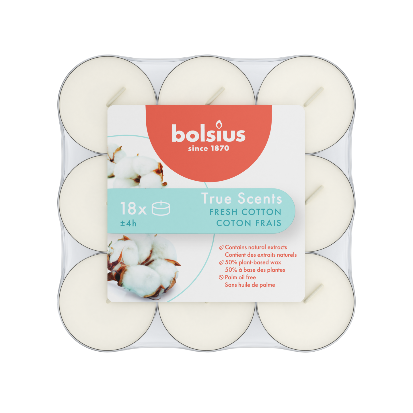 Nauti pitkäkestoisesta tuoksuelämyksestä Bolsius True Scents Fresh Cotton -tuoksullisilla lämpökynttilöillä ja koe vasta pestyjen puuvillalakanoiden puhdas tuoksu. Nämä lämpökynttilät takaavat puhtaimman tuoksun vapautumisen jopa 4 tunniksi, kiitos CleanScent-teknologiamme. Tämä teknologia yhdistää ainutlaatuisesti puhtaimman vahamme ja erityisesti kehitetyn puuvillasydämen, joka haihduttaa tuoksun optimaalisesti. Valmistettu ilman palmuöljyä, luonnonuutteilla ja kasvipohjaisella vahalla. True Scents -mallistomme tarjoaa useita tuotteita, joissa on trendikkäitä tuoksuja ja moderneja klassikoita, joista voit nauttia oman kotisi mukavuudessa.