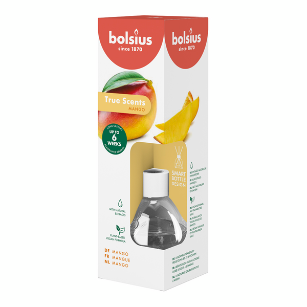 Nauti Mango tuoksuisen True Scents -huonetuoksun pitkään kestävästä tuoksuelämyksestä. Pullo on muotoiltu siten, että kolme tuoksutikkua voidaan asetella optimaalisesti. Optimaalisen vegaanisen koostumuksen ansiosta tuoksutikut levittävät miellyttävää tuoksuaan jopa 6 viikon ajan. Nauti mangon trooppisesta tuoksusta aivan kuin olisit eksoottisella saarella. Koe hedelmäisen mangon puhdas tuoksu mukavasti omassa kodissasi.