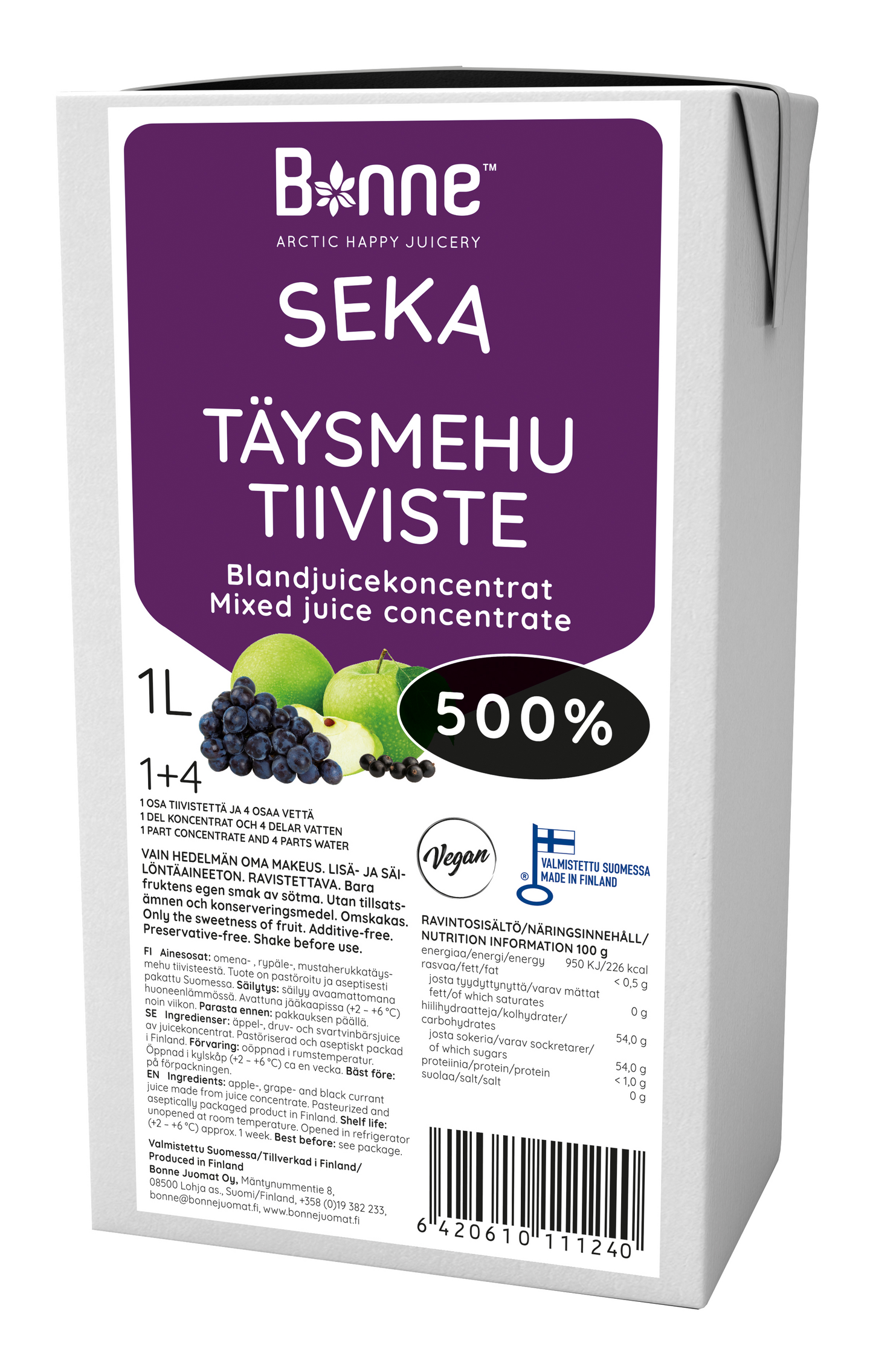Omena-, rypäle- ja mustaherukkatäysmehu tiivistestä