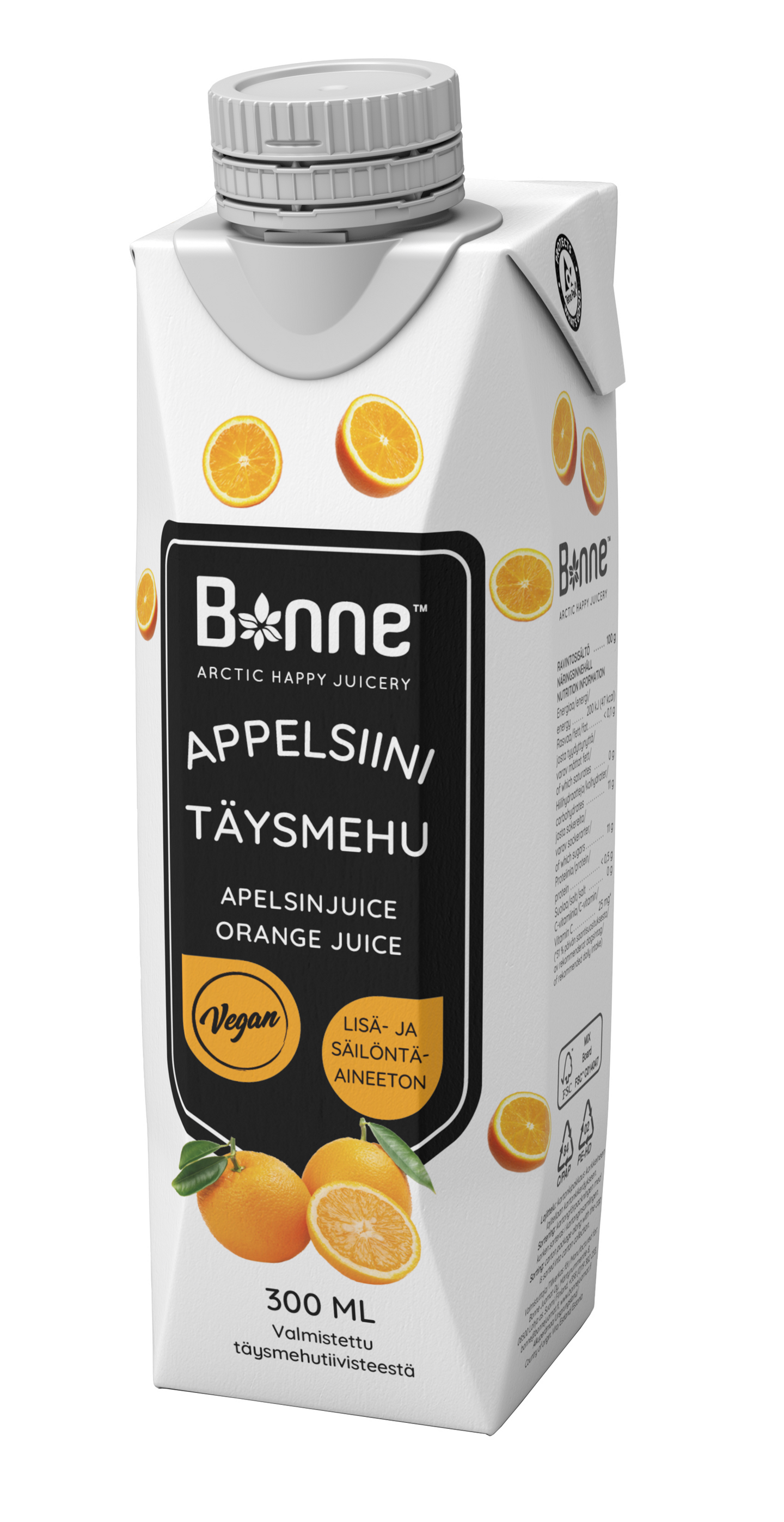 VegaaninenBonne Appelsiinitäysmehu on tiivisteestä valmistettua 100% täysmehua. Mehu on lisä- ja säilöntäaineeton. Mehuun on lisätty C-vitamiinia. Appelsiinitäysmehu on makeuttamaton, se sisältää vain hedelmän oman makeuden.