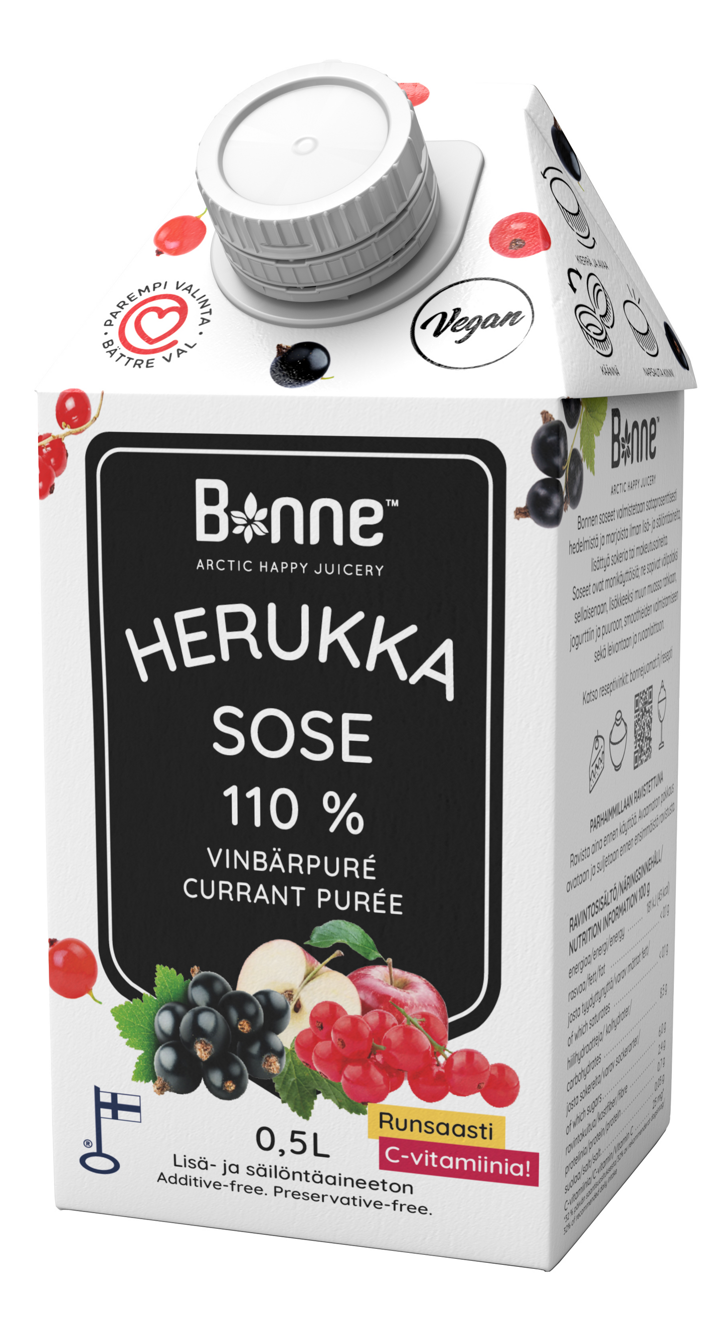 VegaaninenBonne Herukkasose on makeuttamaton 110 % hedelmäsose. Se on hyvää sellaisenaan välipalana sekä lisukkeena esim. puuron, jogurtin tai rahkan kanssa. Herukkasose sopii myös smoothie-juomien, keittojen ja kiisseleiden sekä erilaisten jälkiruokien valmistukseen. Ei sisällä lisättyä sokeria, eikä lisä- tai säilöntäaineita. Sose säilyy avaamattomana huoneenlämmössä, ja se on pakattu kätevään korkilliseen 0,5 litran kierrätettävään pakkaukseen.