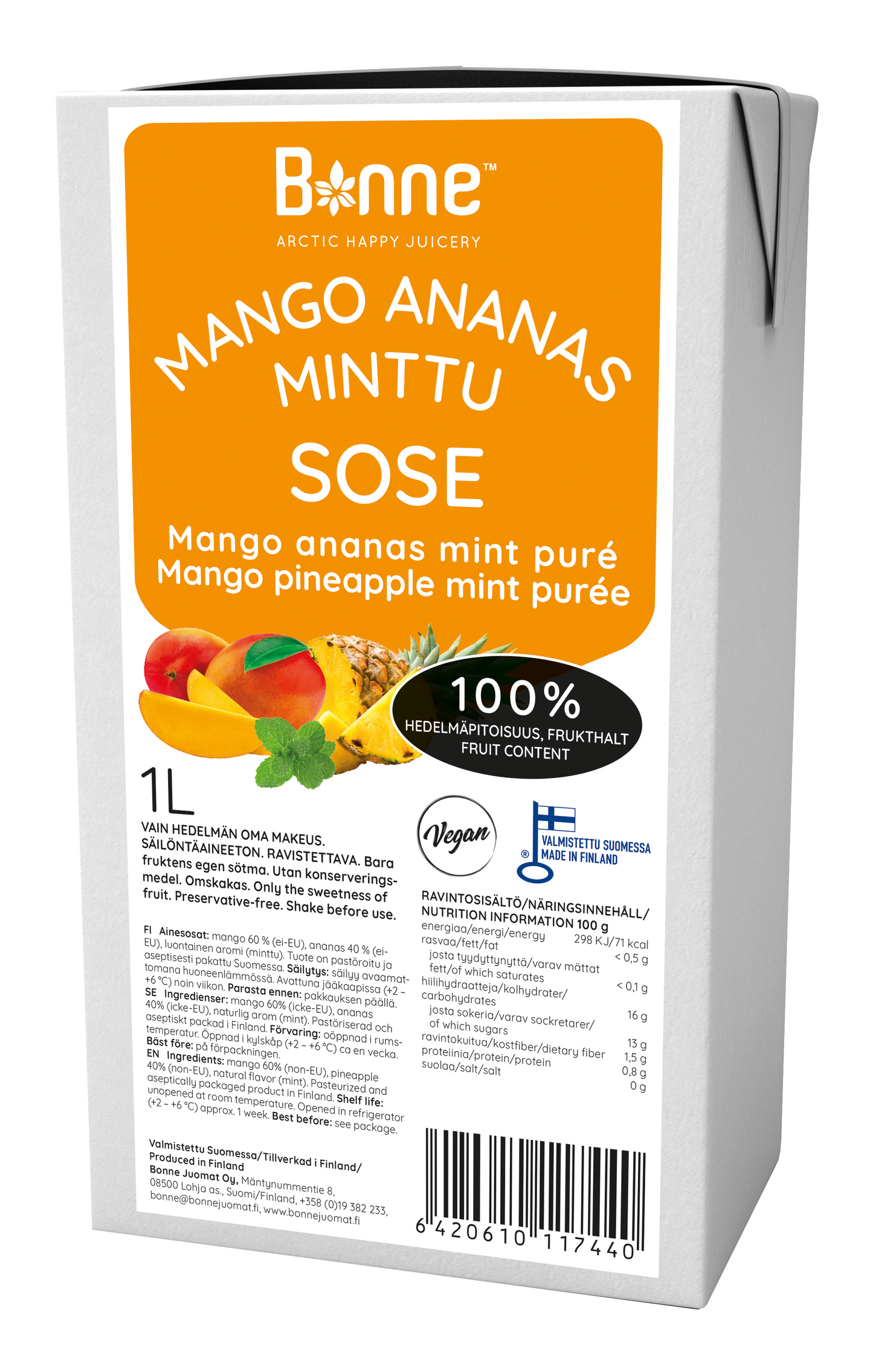 Raikas, lempeästi mintulle maistuva Mango-ananas-minttusose on valmistettu hedelmistä ilman lisä- ja säilöntäaineita, eikä siihen ole lisätty sokeria. Sose sisältää vain hedelmän oman makeuden. Hedelmäpitoisuus on 100%. Sose soveltuu monipuoliseen ruoanlaittoon.
