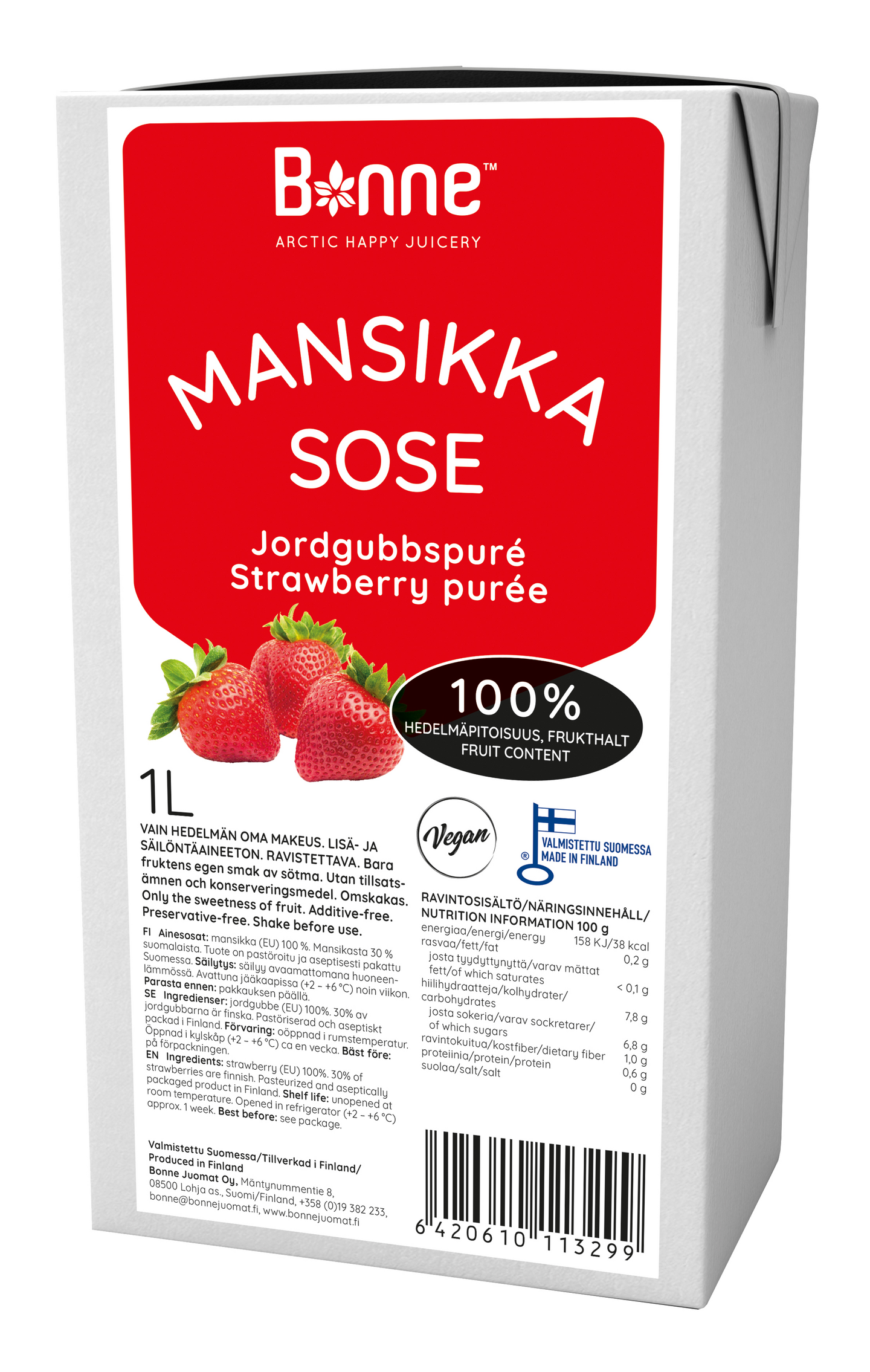 Bonne Premium Mansikkasose on makeuttamaton, ei sisällä lisättyä sokeria, 100 -prosenttinen marjasose. Se sopii jälkiruokiin, leivontaan, ruoanlaittoon ja juomiin. Säilöntäaineeton.