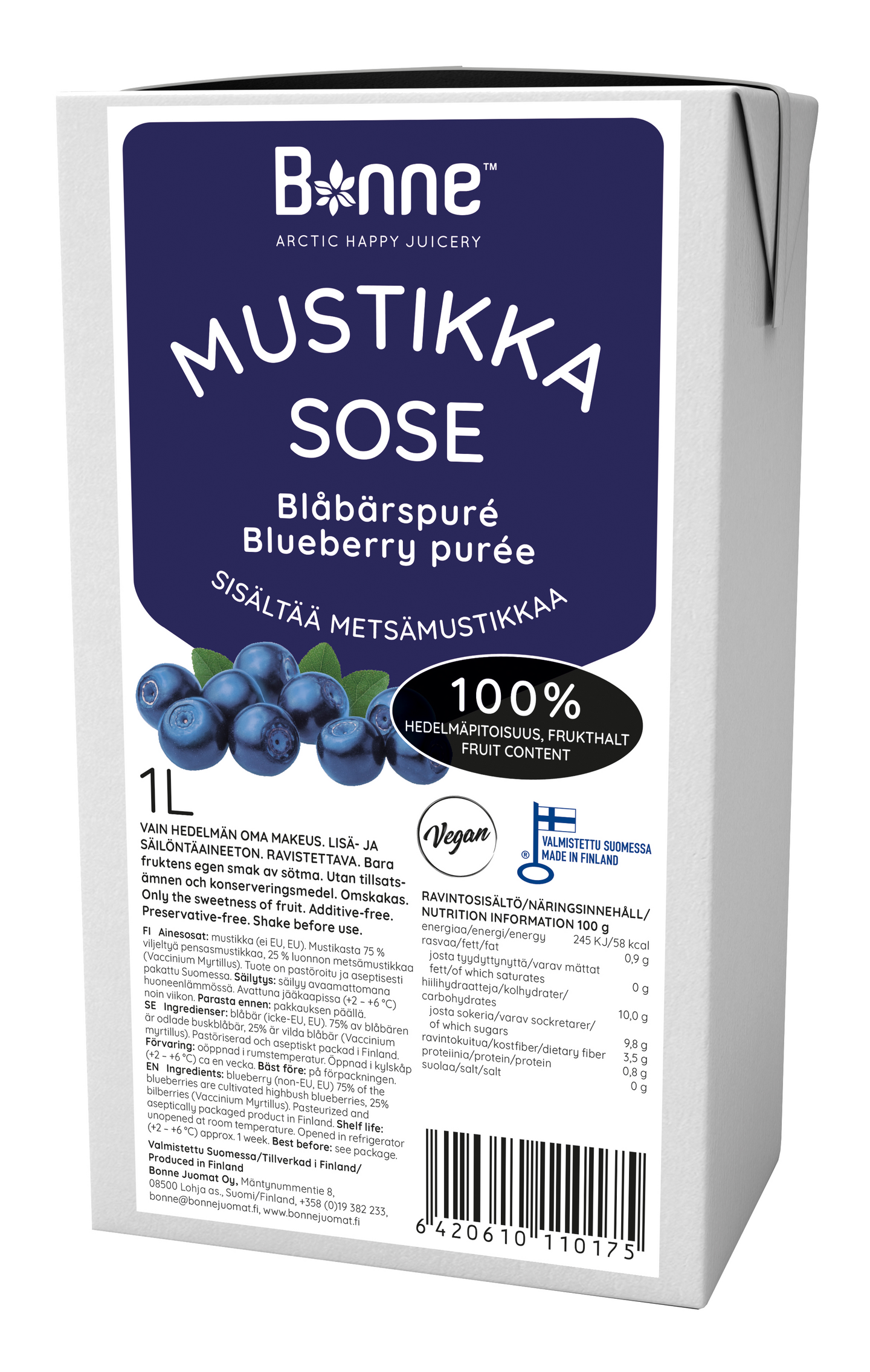 mustikka (ei-eu, eu). Mustikasta 75 % viljeltyä pensasmustikkaa, 25 % luonnon metsämustikkaa (Vaccinium Myrtillus).