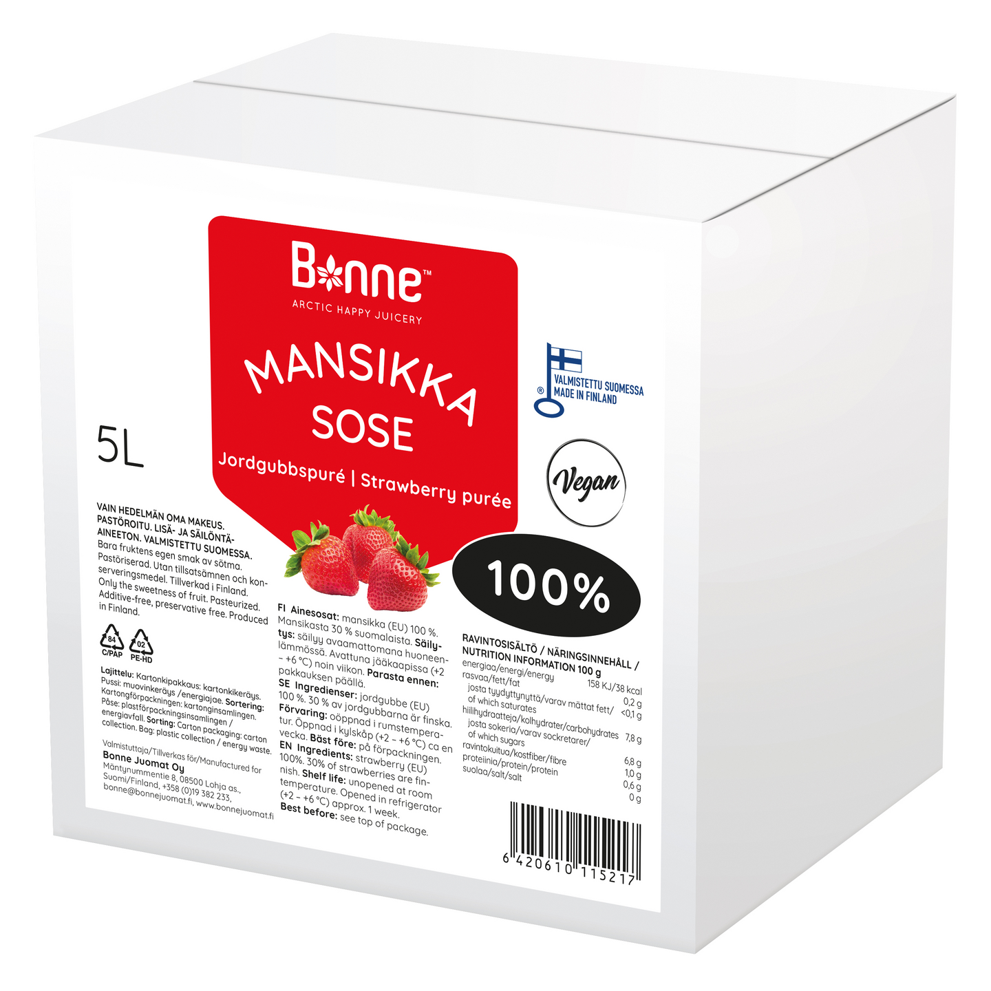 Mansikka (eu) 100%. Mansikasta 20% suomalaista. Hedelmäpitoisuus 100%