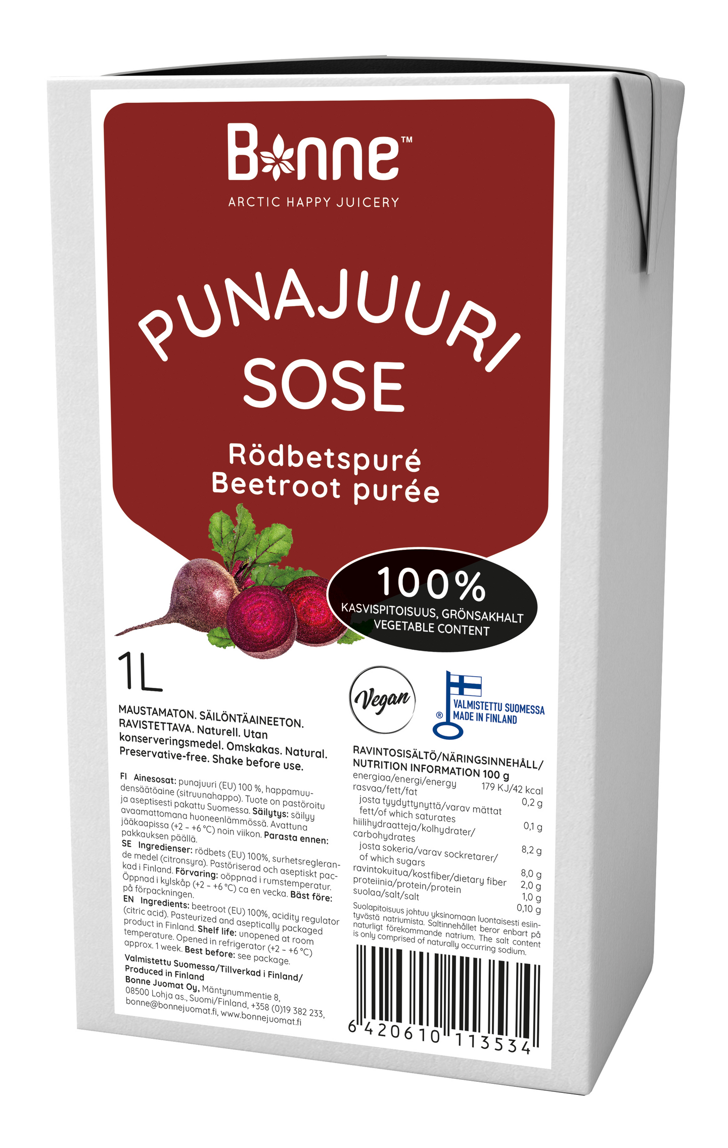 Bonne Punajuurisose on maustamaton, lisäaineeton ja säilöntäaineeton, 100-prosenttinen juuressose. Punajuurisose on pastöroitu ja aseptisesti pakattu Suomessa. Sose sopii sellaisenaan monipuoliseen ruoanlaittoon. Punajuuren alkuperämaa on Puola.