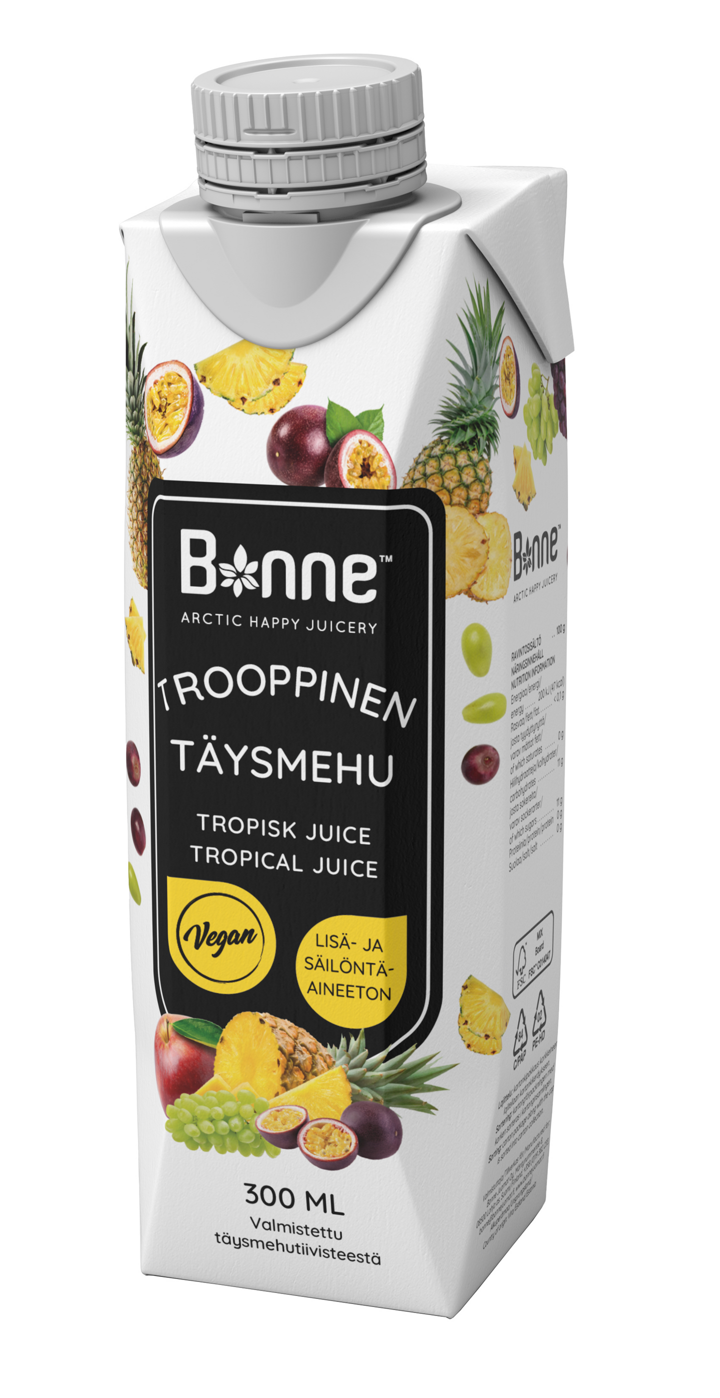 VegaaninenBonne trooppinen täysmehu on omena-, rypäle-, ananas- ja passionhedelmätäysmehutiivisteistä valmistettua 100% täysmehua. Mehu on lisä- ja säilöntäaineeton. Trooppinen täysmehu on sisältää vain hedelmän oman makeuden.