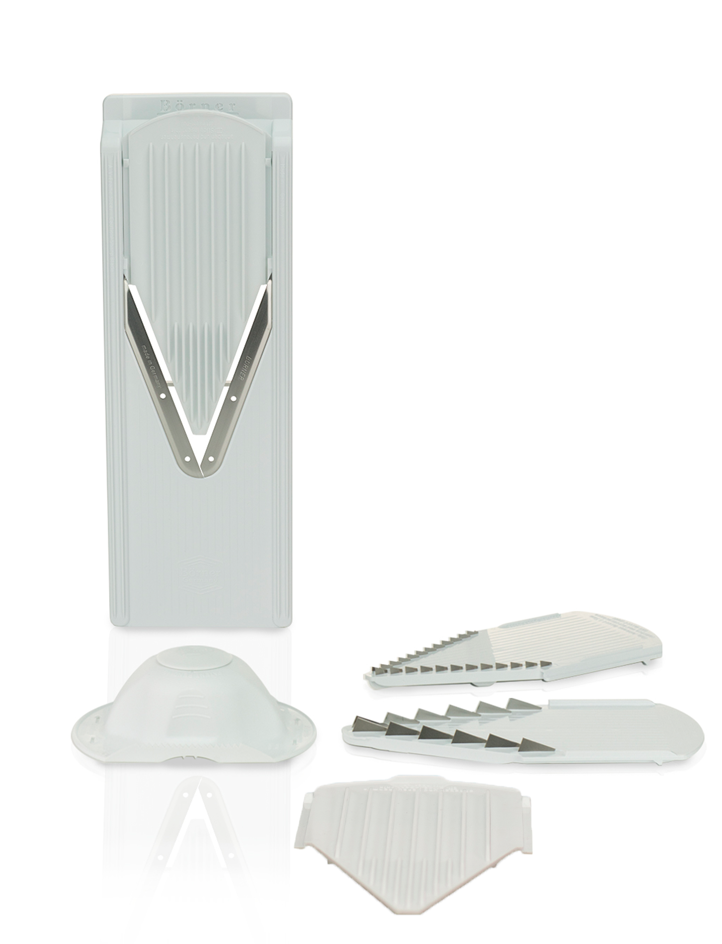 V3-mandoliini on maineensa arvoinen klassikkomalli. Kestävä ja huippulaadukas V3 edustaa ensiluokkaista saksalaista osaamista ja on erittäin suosittu ympäri maailman. V3-mandoliinin avulla voit tehdä vihanneksista ja hedelmistä sekä ohuita että paksuja viipaleita. Terillä varustettuja viipalointilevyjä (3,5 mm tai 7 mm) käyttämällä onnistuvat suikaleet ja jopa kuutiot. Terät ovat äärimmäisen terävät, joten suosittelemme, että käytät mukana tulevaa turvapidikettä aina mandoliinia käyttäessäsi. Astianpesukoneessa terät saattavat tylsyä nopeammin, joten suosittelemme käsinpesua. Huuhtele mandoliini heti käytön jälkeen juoksevan veden alla. Käytä tarvittaessa astianpesuainetta ja tiskiharjaa, mutta varo tylsyttämästä terää tiskiharjalla. Pakkaus sisältää V3 TrendLine -mandoliinin, viipalointilevyn (ohuet ja paksut viipaleet), 3,5 mm viipalointilevyn terin (julienne), 7 mm viipalointilevyn terin (julienne) ja turvapidikkeen.