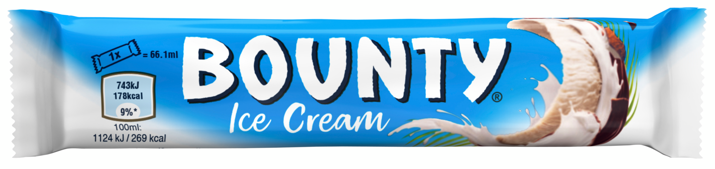 BOUNTY®-kermajäätelöpatukassa on kookosjäätelöä kuorrutettuna kaakaolla ja kookoshippusilla. BOUNTY® kermajäätelöpatukka 51,6g