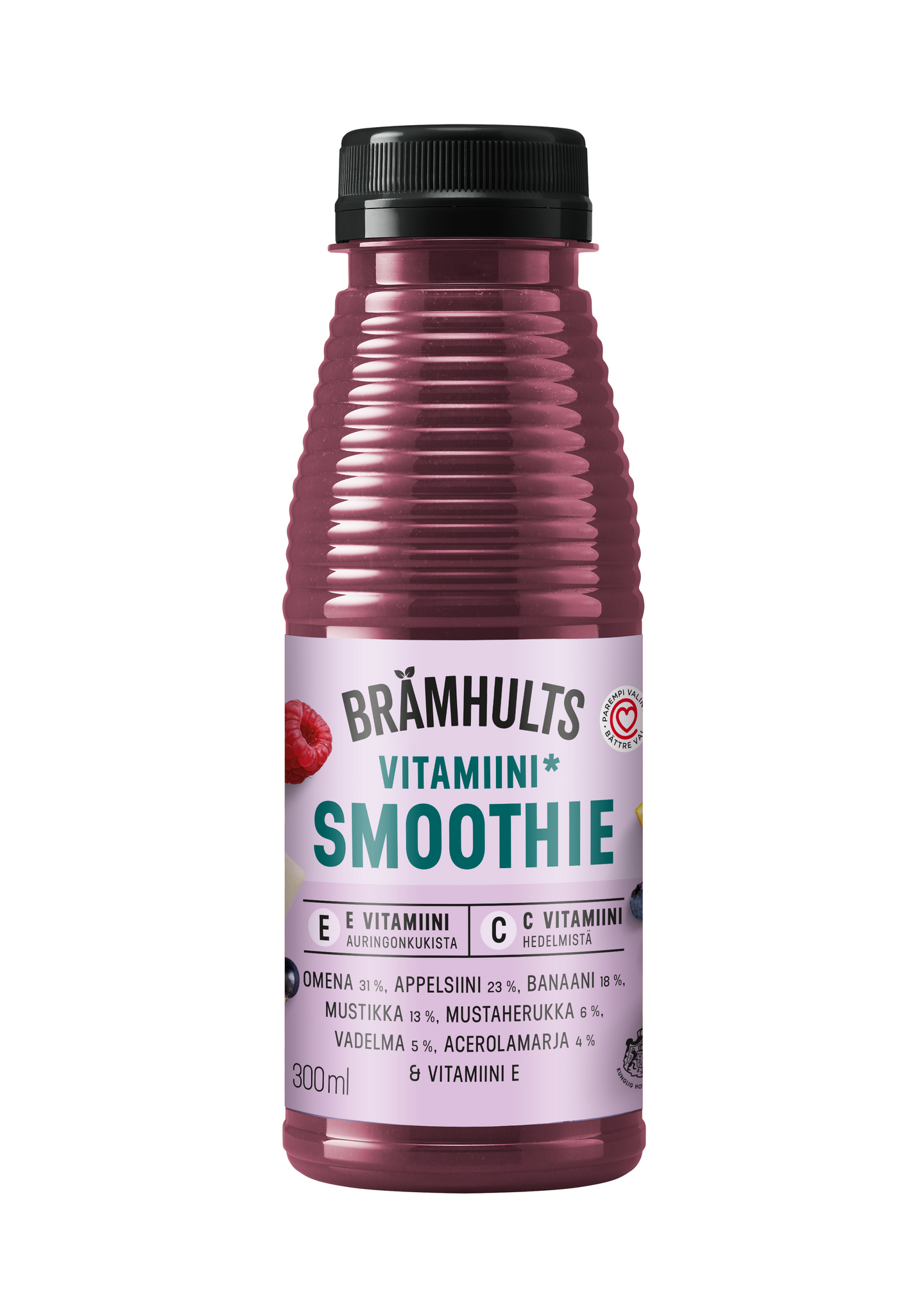 Appelsiinitäysmehu (23 %), soseutettu omena (20 %),banaani (18 %) ja mustikka (13 %), omenatäysmehu (11 %), soseutettu mustaherukka (6 %), soseutettu vadelma (5 %), soseutettu acerolamarja (4 %) ja E-vitamiini. Pastöroitu