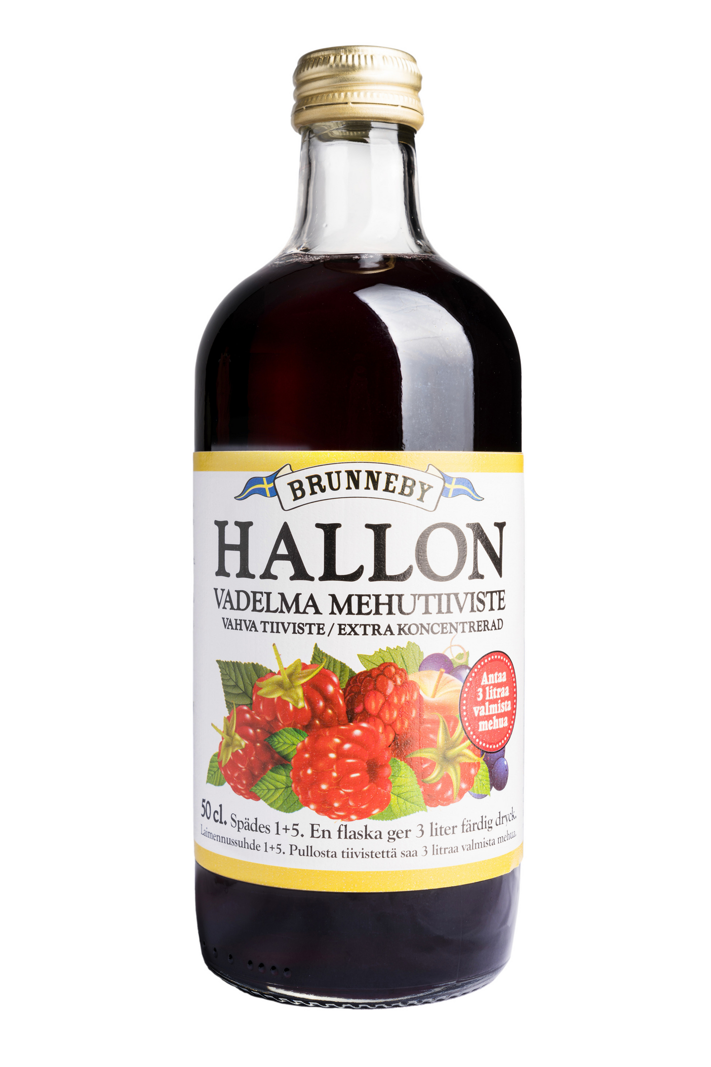 Valmistamme Brunnebyn vadelmamehun auringon kypsyttämistä vadelmista ja makeutamme sen omenalla, viinirypäleillä ja sokerilla. Sopii myös erinomaisesti kiisselin valmistukseen. Yhdestä pullosta saa 3 litraa valmista juomaa. Pastöroitu.
