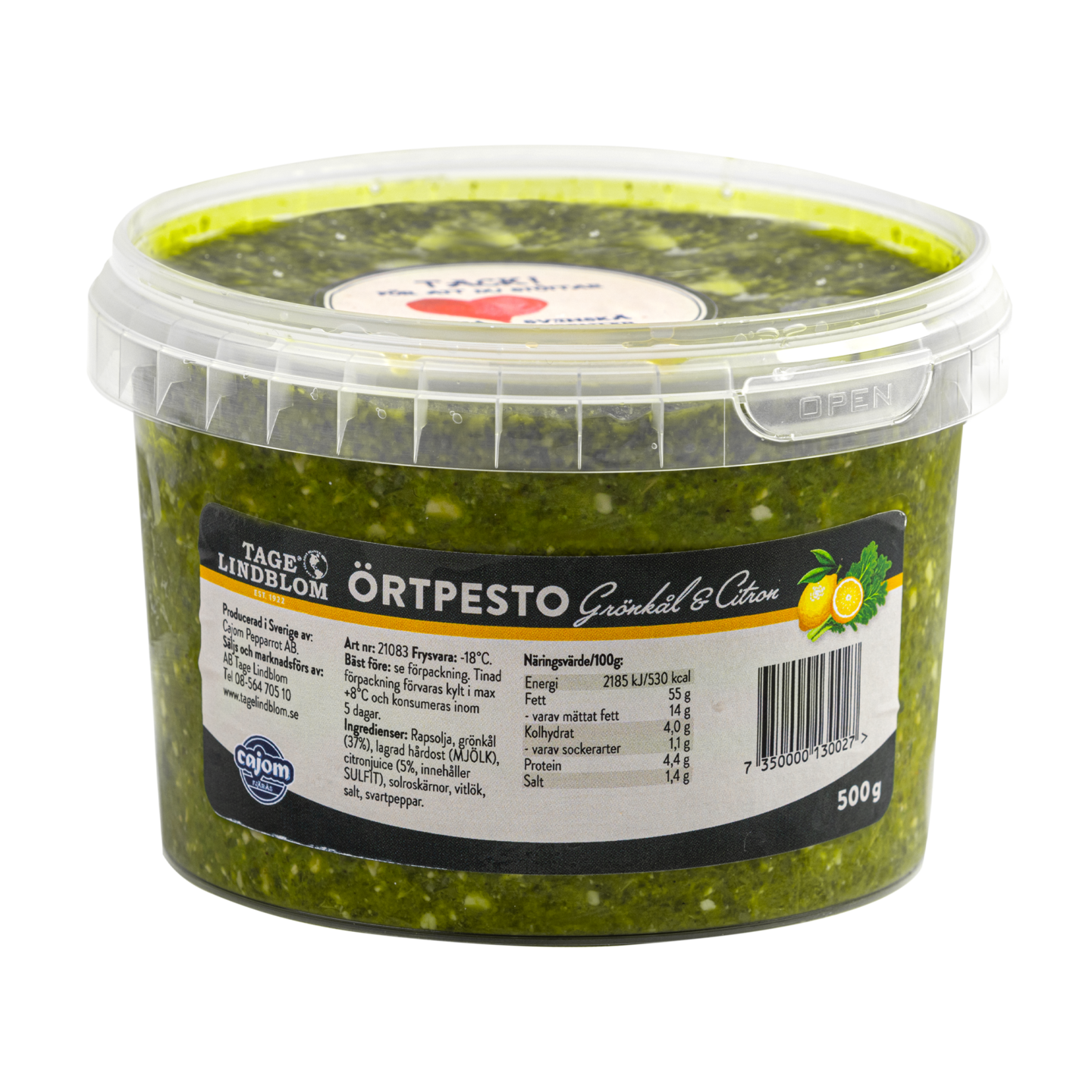PÄHKINÄTÖN, raikas lehtikaalilla ja sitruunalla maustettu yrttipestomme on valmistettu pähkinöiden sijaan auringonkukansiemenillä, eikä se sisällä säilöntä- ja lisäaineita. Tuote on valmistettu Ruotsissa. Soveltuu erinomaisesti grillattujen ruokien, leipien, salaattien, pastan, pizzan, kala- ja kasvisruokien valmistukseen. Aina on syy pestomme pöydälle! Toimitetaan pakastettuna, mikä antaa sille pitkän säilyvyyden. Sulatus jääkaapissa (12h) on suositeltavaa, mutta sen voi sulattaa myös huoneenlämmössä (5-6h).