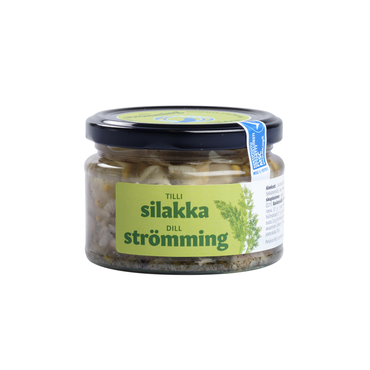 Suomalainen SILAKKA (pyydetty troolilla selkämereltä), vesi, sokeri, etikka, sipuli, tilli 3,2%, suola, SINAPINSIEMEN, valko- ja maustepippuri, säilöntäaine (E211).