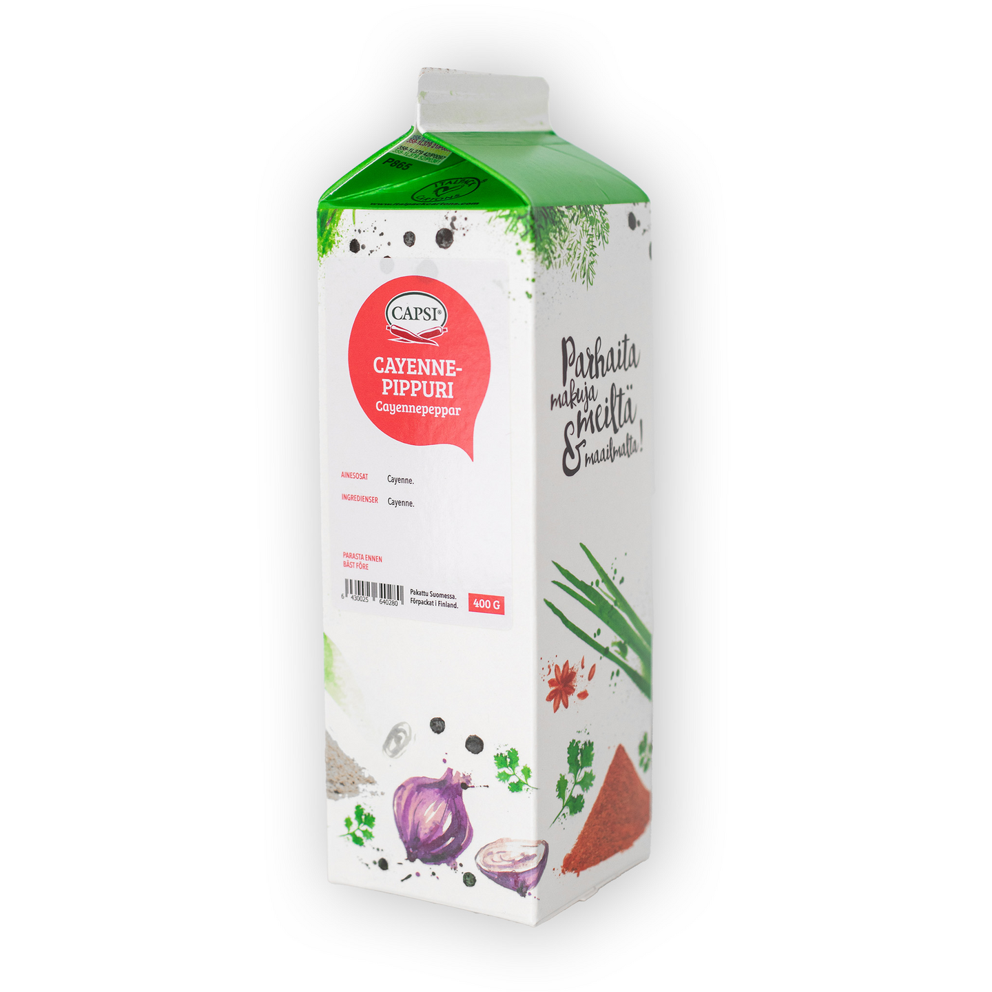 Capsi cayennepippuri on voimakkaan tulinen mauste joka sopii muna-, kala-, kana- ja liharuokien maustamiseen.