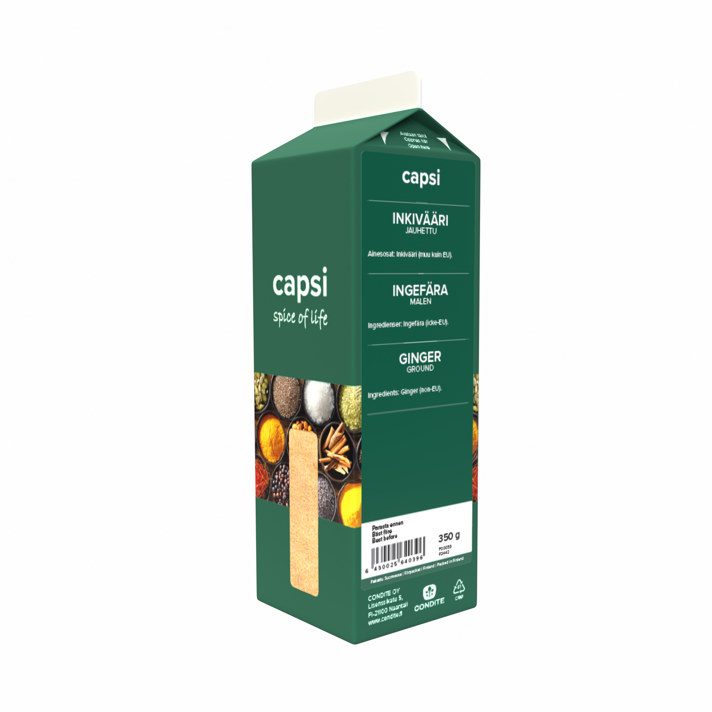 Capsi jauhettu inkivääri sopii erinomaisesti piparkakkujen, maustekakkujen, omenaleivonnaisten sekä itämaisten – ja porsaanliharuokien maustamiseen.
