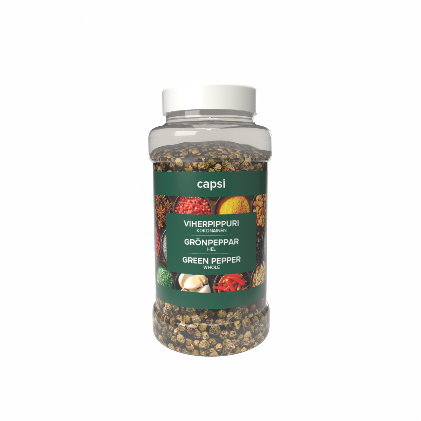 Miedonmakuinen Capsi kokonainen viherpippuri sopii liha-, kala- ja kasvisruokien sekä kastikkeiden ja salaattien maustamiseen. Viherpippuri lisätään ruokiin murskattuna tai kokonaisena.