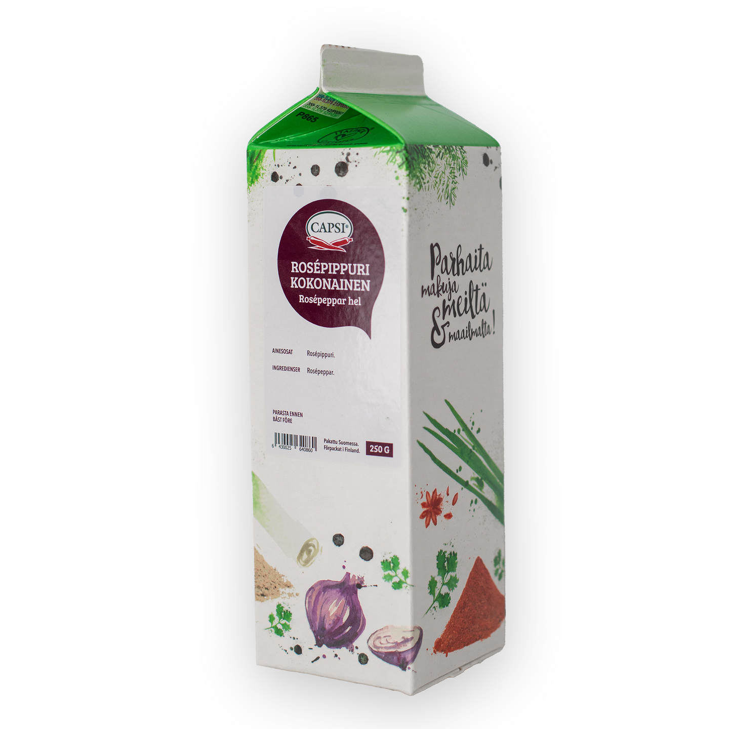 Capsi rosépippuri on maultaan mieto, aromaattinen ja hieman makeahko. Keveästi maustavana rosépippuri sopii hyvin kalaruokiin, kasvisruokiin, perunapaistoksiin, herkkusienisalaatteihin ja graavikalaan sekä jälkiruokiin, esimerkiksi hedelmäsalaattiin ja jäätelöön. Rosépippurilla voit myös koristella ruokia ja jälkiruokia.