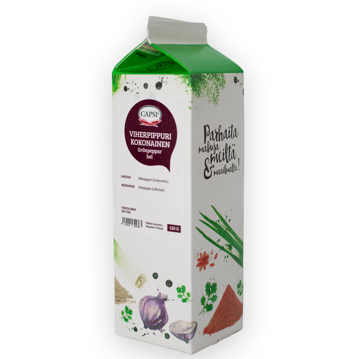 MaidotonMiedonmakuinen Capsi kokonainen viherpippuri sopii liha-, kala- ja kasvisruokien sekä kastikkeiden ja salaattien maustamiseen. Viherpippuri lisätään ruokiin murskattuna tai kokonaisena.