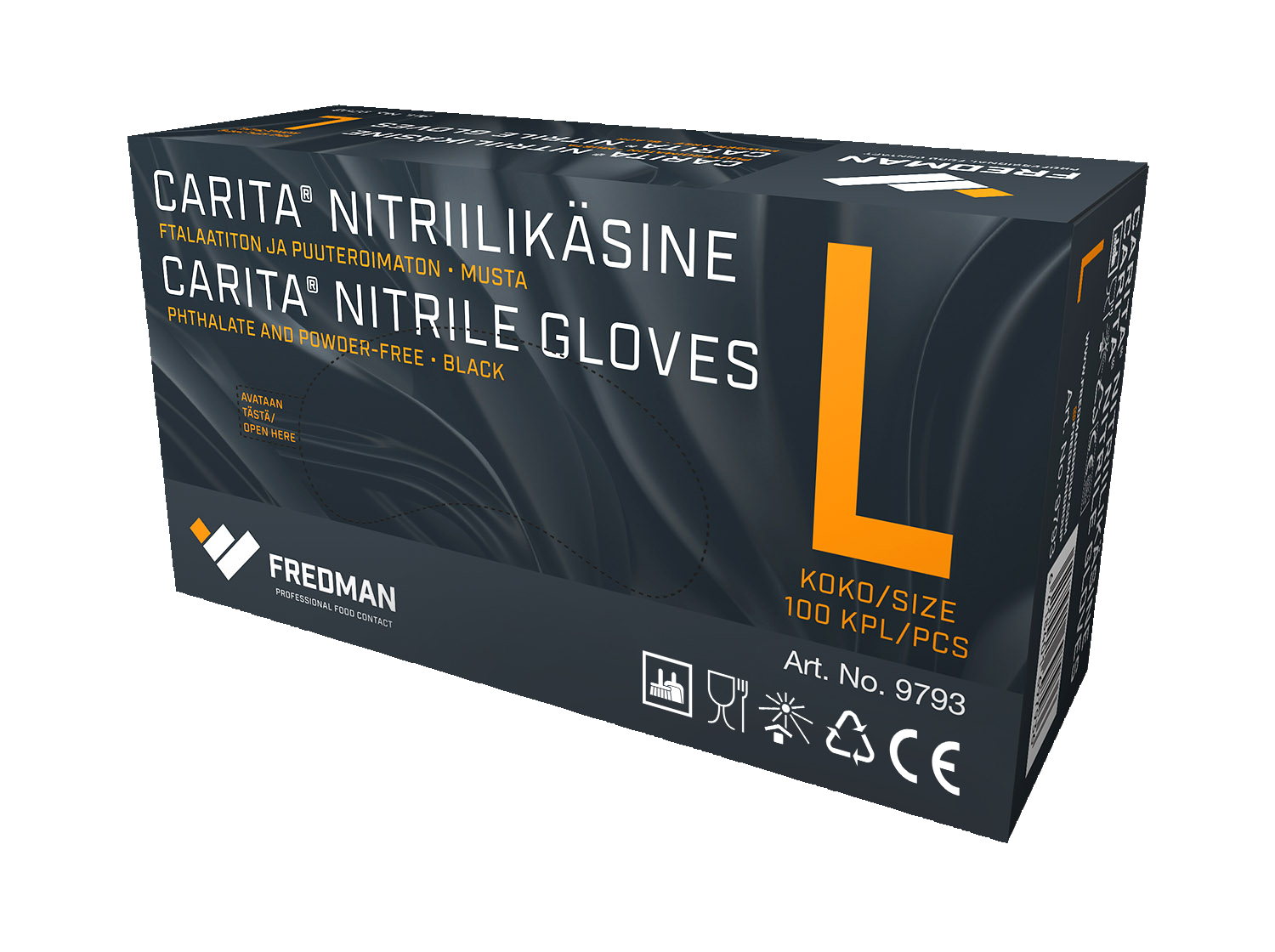Fredman Carita® nitriilikäsineet ovat keittiöammattilaisen valinta elintarvikkeiden käsittelyyn tai käsien suojaamiseen siivotessa. Käsineemme ovat tyylikkäästi mustat, niissä ei ole puuteria ja ne tuntuvat kädessä mukavilta. Nitriilikäsineitämme voit turvallisesti käyttää myös rasvaista ruokaa käsitellessäsi.