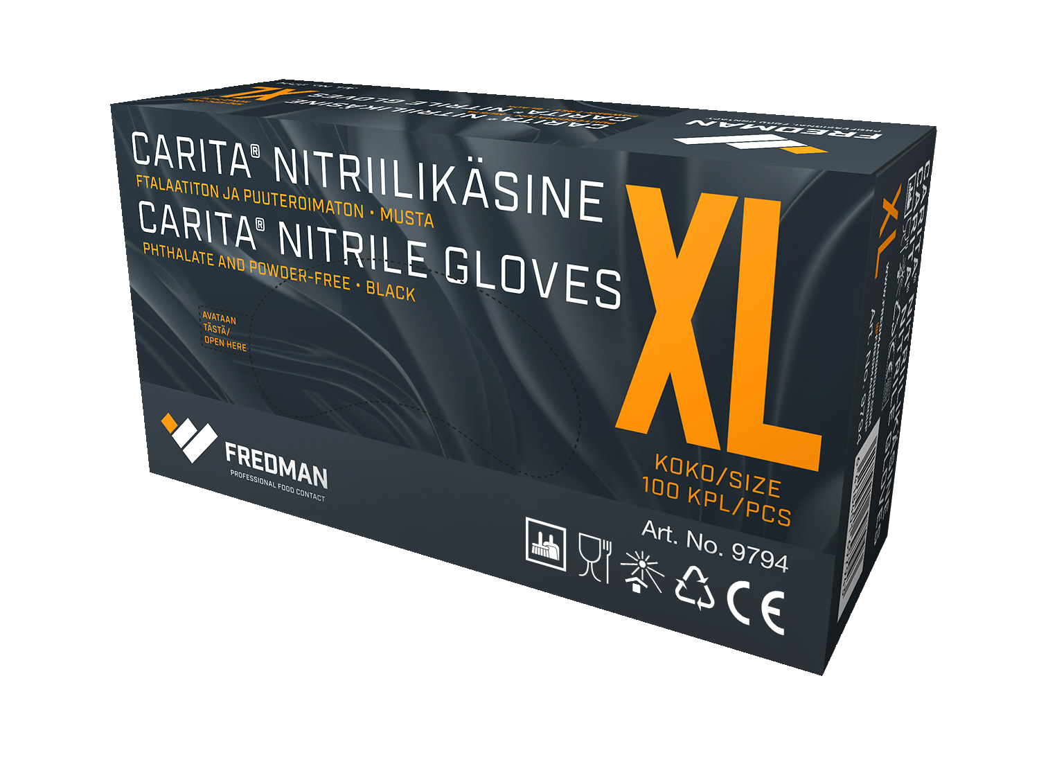 Fredman Carita® nitriilikäsineet ovat keittiöammattilaisen valinta elintarvikkeiden käsittelyyn tai käsien suojaamiseen siivotessa. Käsineemme ovat tyylikkäästi mustat, niissä ei ole puuteria ja ne tuntuvat kädessä mukavilta. Nitriilikäsineitämme voit turvallisesti käyttää myös rasvaista ruokaa käsitellessäsi.