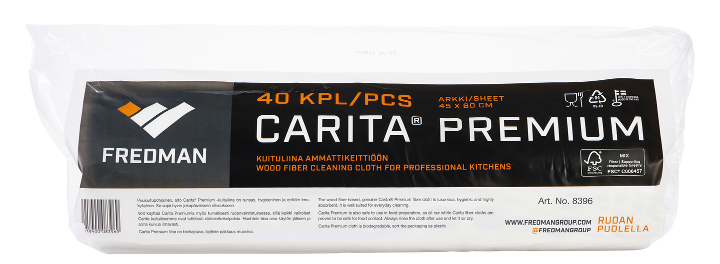 Kotimainen Fredman Carita® Premium on yleisliinojen huippua - mahtavan imukykyinen, hygieeninen ja nukkaamaton. Paksu liina pystyy imemään yli 10-kertaisesti oman painonsa nestettä. Käytetyt Fredman Carita® Premium liinat voit laittaa huoletta biojäteastiaan, sillä ne ovat täysin biohajoavia.