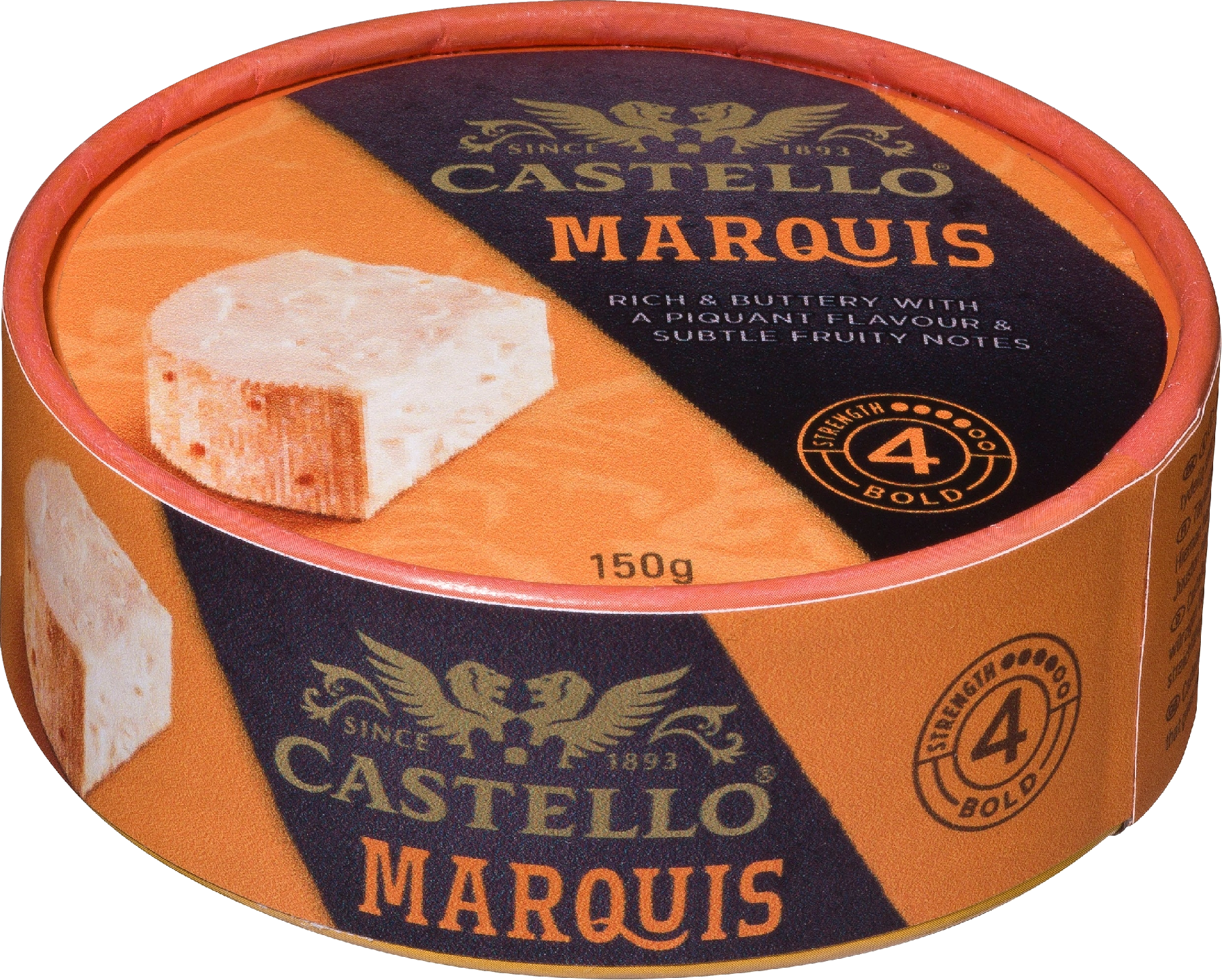 Marquis on täyteläinen ja mieto, pehmeä ja runsasrasvainen, pinnalta ja sisältä homekypsytetty kittipintainen puna-sinihomejuusto. Laktoositon.