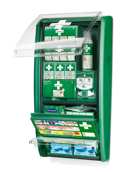 Ensiapuasema työympäristöihin, joissa on riski saada palovammoja ja viiltohaavoja, kuten keittiöissä, elintarvikealalla ja tulitöissä. Nykyaikaisen ensiapuaseman tarvikkeet ovat läpinäkyvän kannen ansiosta selkeästi havaittavissa ja täydennystarpeet näkee yhdellä silmäyksellä. Pöly- ja roiskesuojattuna se soveltuu haastaviinkin olosuhteisiin. Täydennä palovammatuotteilla varustettu ensiapuasema huuhtelupulloparilla ja saat työpisteeseen monipuolisen ja kattavan ensiapuvarustuksen.