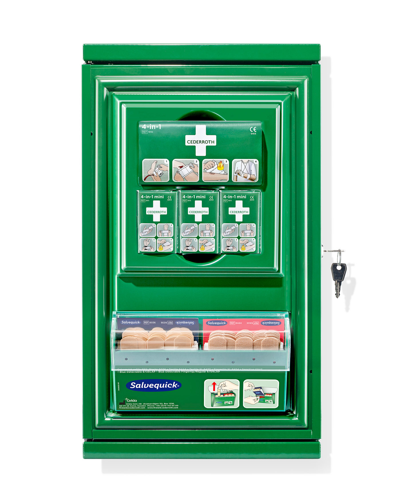 Lukollinen, pölytiivistetty peltikaappi, jonka ovessa pieni haavahoitopiste. Soveltuu pienille työpaikoille tai täydennykseksi muuhun ensiapuvarustukseen.