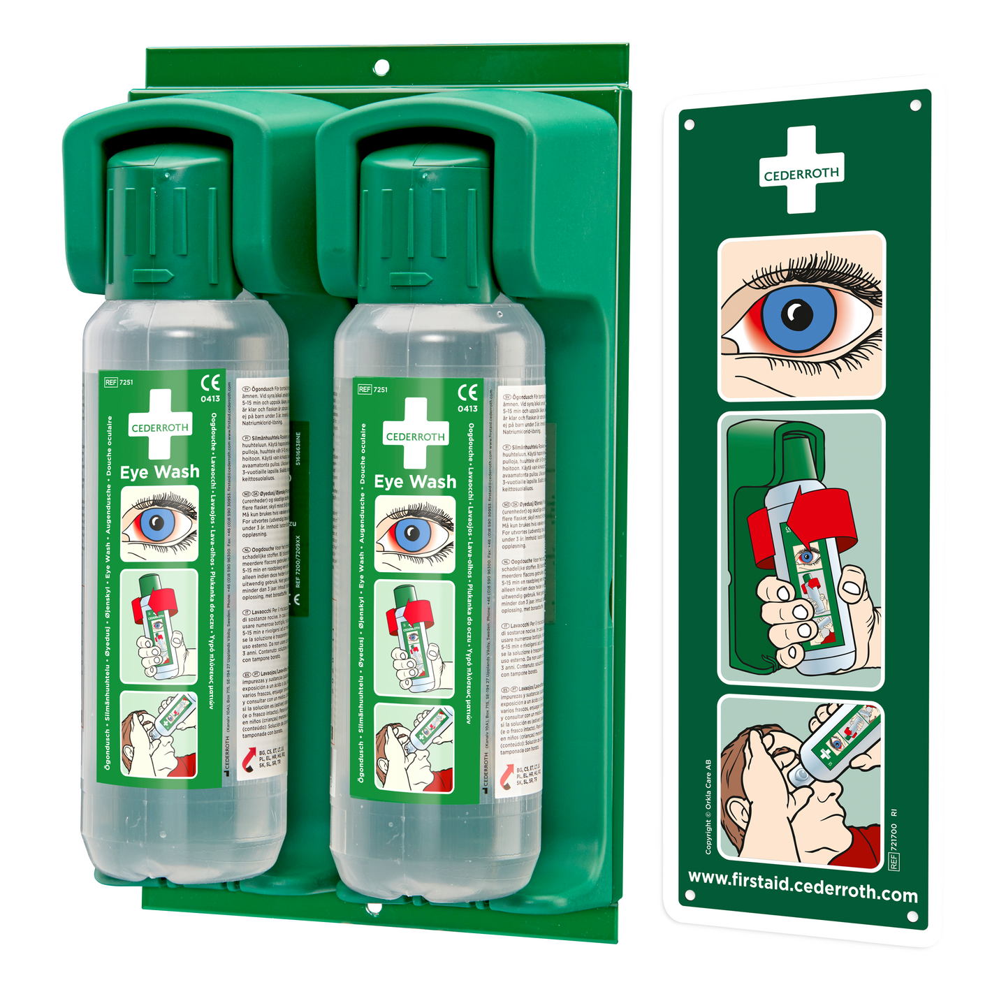 Kestävä ja käytännöllinen seinäteline kahdelle 500 ml:n Cederroth silmänhuuhtelupullolle. Seinätelineessä silmänhuuhtelupullot ovat lukittuna telineessään ja avautuvat automaattisesti, kun ne kierretään irti - silmänhuuhtelu voidaan aloittaa välittömästi. Jälkivalaiseva ohjekilpi mukana. Silmänhuuhtelupullot tilattava erikseen.