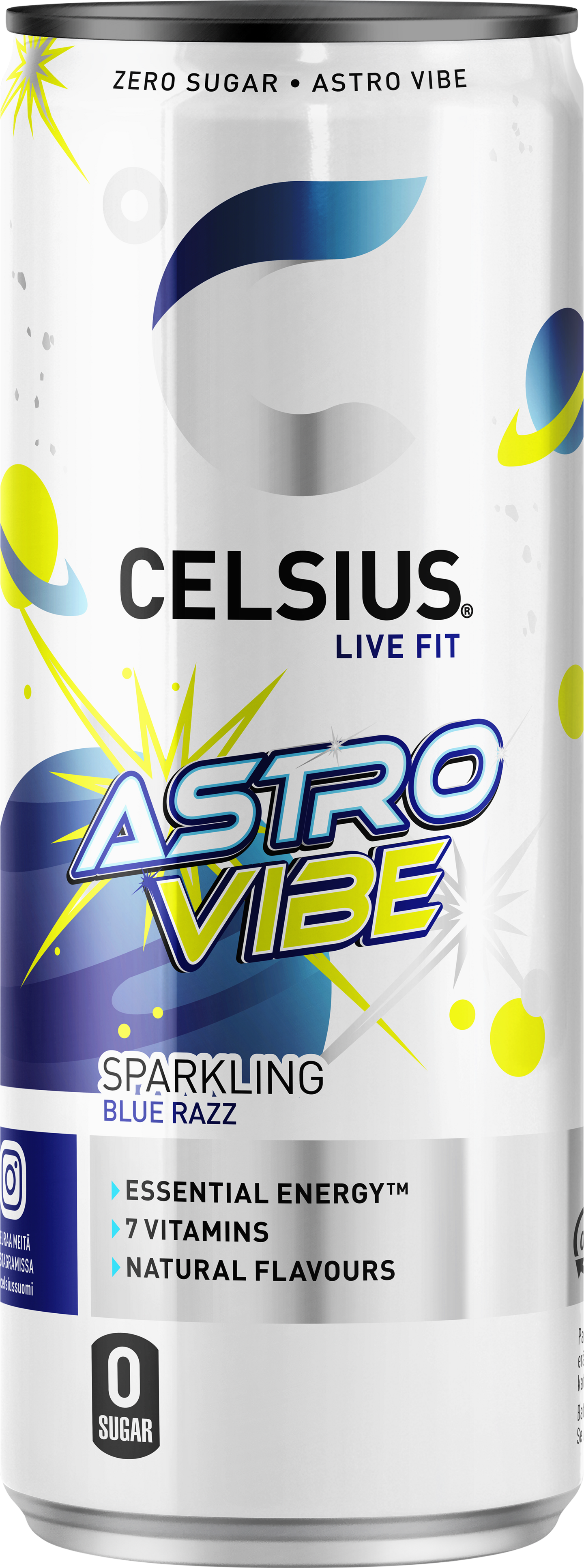 Avaruuden inspiroima Celsius Astro Vibe on kiehtova makuelämys, joka tarjoilee sinisen vadelman makuisen energiabuustin! Raikkaanmakuinen Celsius Astro Vibe sisältää uniikin yhdistelmän vitamiineja, kofeiinia, guaranaa ja vihreän teen uutetta. Kuten aina, Celsius Astro Vibe on sokeriton ja sisältää vain luontaisia aromeja. Celsius on 100 % vegaaninen.