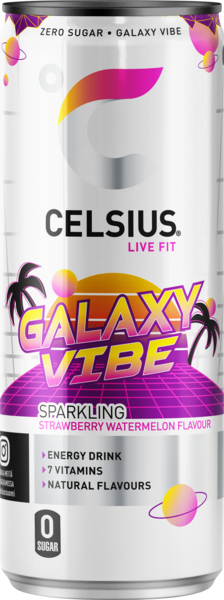 Avaruuden inspiroima Celsius Galaxy Vibe tarjoilee mansikan ja vesimelonin makuisen energiabuustin, jonka maku vie eloisaan, mystiseen Galaxiin! Raikkaanmakuinen Celsius Galaxy Vibe sisältää uniikin yhdistelmän vitamiineja, kofeiinia, guaranaa ja vihreän teen uutetta. Kuten aina, Celsius Galaxy Vibe on sokeriton ja sisältää vain luontaisia aromeja. Celsius on 100 % vegaaninen.