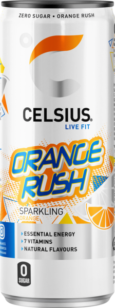 Celsius Orange Rush tarjoilee piristävän ja mehukkaan energiabuustin! Raikas appelsiininmaku suorastaan hehkuu aurinkoista energiaa! Celsiuksen takuuvarmasti virkistävä vaikutus perustuu ainutlaatuiseen yhdistelmään vitamiineja, kofeiinia, guaranaa ja vihreän teen uutetta. Kuten aina, Celsius Orange Rush on sokeriton ja sisältää vain luontaisia aromeja. Celsius on 100 % vegaaninen.