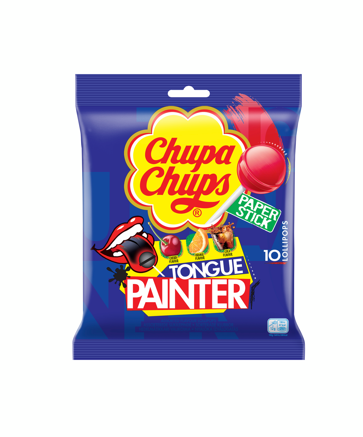 Chupa Chups Tongue Painter -tikkukaramelli on uusi herkullinen tikkarikonsepti, jossa tikkari maistuu huikean hyvältä ja hauskasti vielä värjää kielen. Pussissa on 10 kpl tikkaria, makuina Kirsikka, Cola sekä Appelsiini. Tuotteessa on paperitikku, joten tikkari on hauskempi myös ympäristölle.