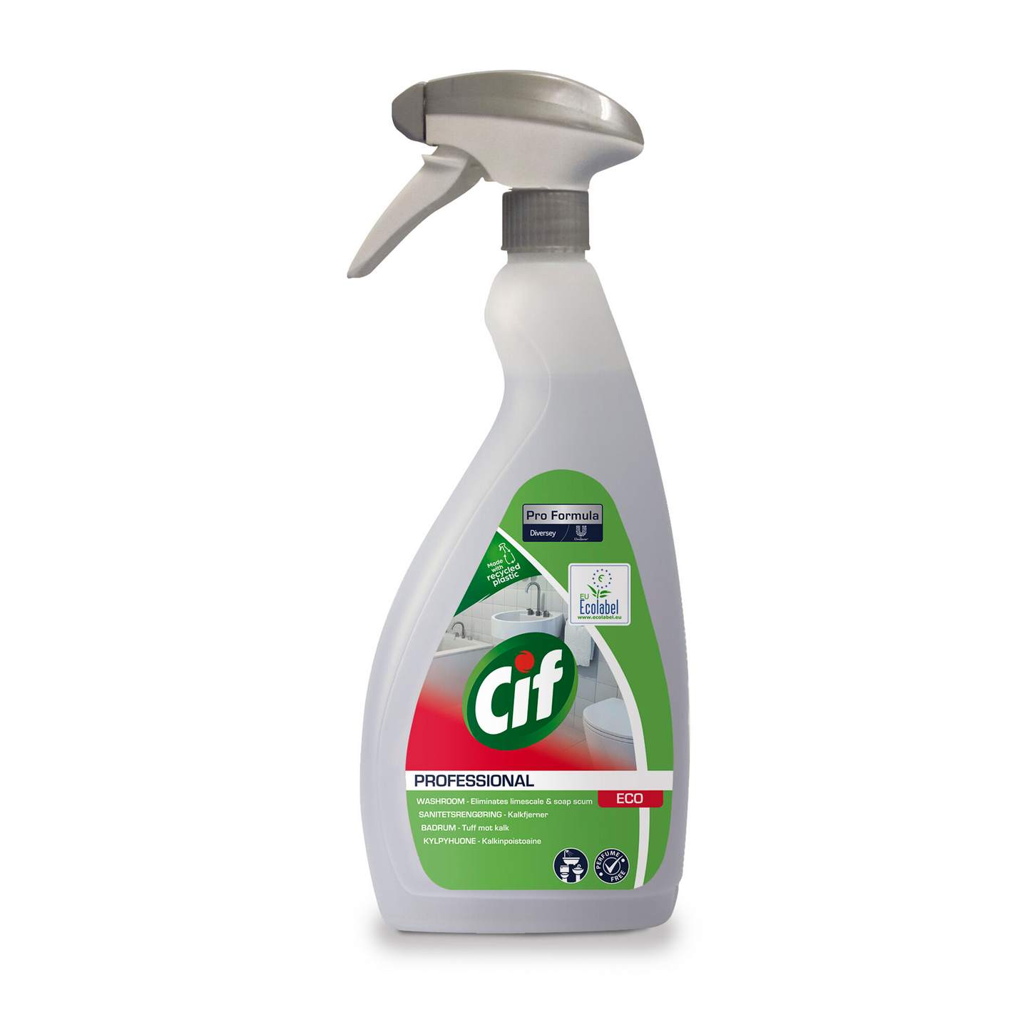 Cif Professional Eco -pesuhuoneen puhdistusaine on hajusteeton ja poistaa tehokkaasti kalkkikertymiä, likaa ja saippuajäämiä kaikilta kylpyhuoneen pinnoilta. Ihanteellinen kylpyammeille, suihkuille, pesualtaille, WC:lle, kromille ja ruostumattomalle teräkselle, muoville ja keramiikalle. Ei sovellu marmorille eikä muille happoherkille pinnoille. Hajusteeton ja väriaineeton.