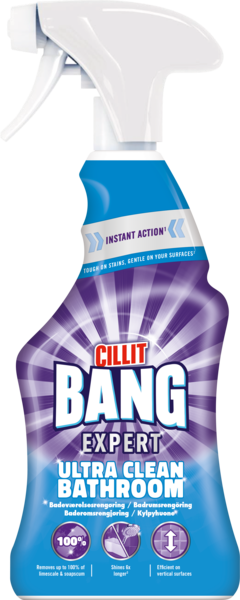 Cillit Bangin avulla kylpyhuoneesi pysyy puhtaana ja kirkkaana pidempään! Tehokas puhdistusaine kylpyhuoneelle poistaa tahrat tehokkaasti ja vaivattomasti. Supertehokas koostumus on kehitetty erityisesti poistamaan nopeasti kalkin, saippuajäämät ja rasvaisen lian. Sen kerrostumista ehkäisevä teknologia estää tahroja tulemasta takaisin. Koostumus on ankara tahroille, mutta hellä kodin pinnoille.