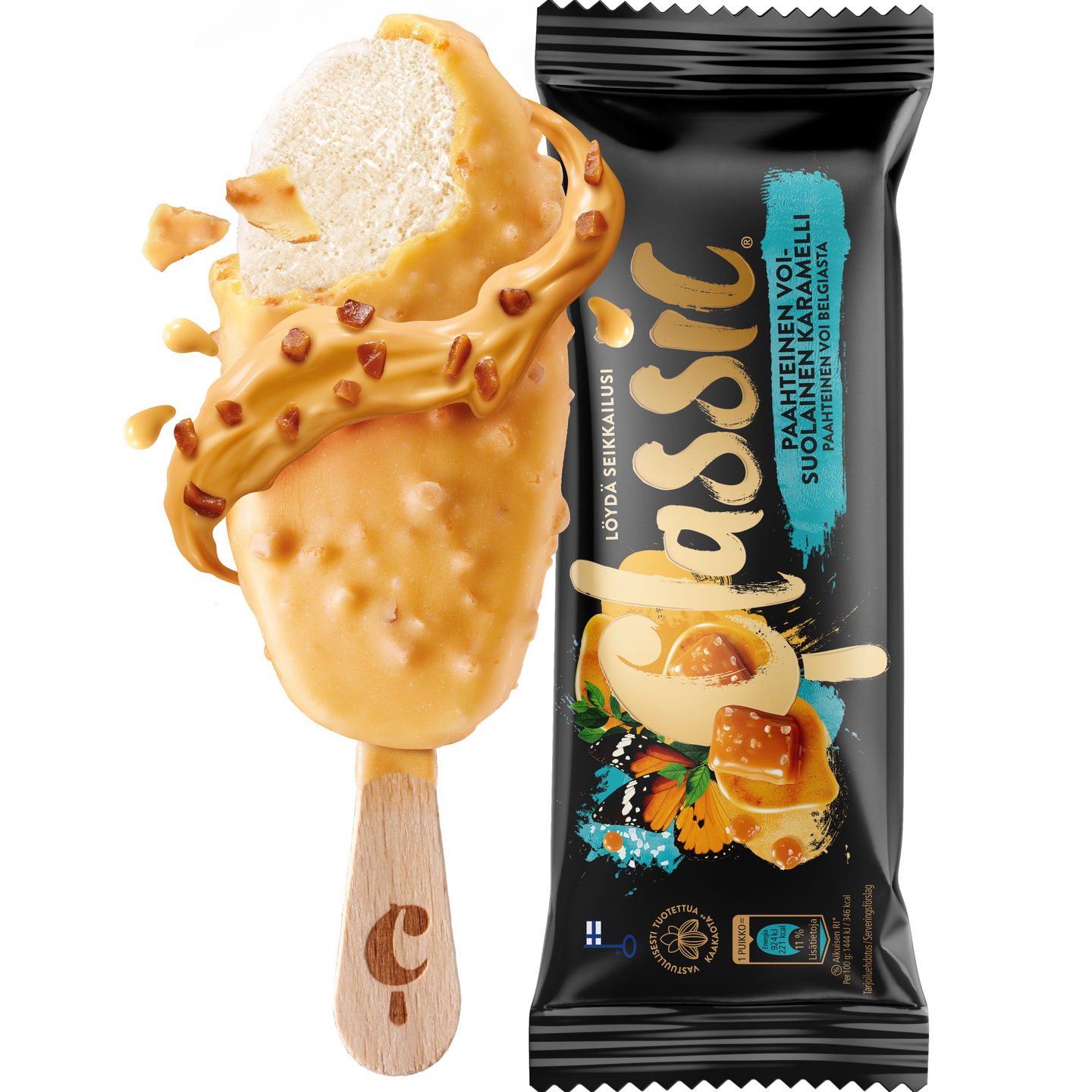 Classic Paahteinen Voi-Suolainen Karamelli jäätelöpuikko takaa täyteläisen jäätelökokemuksen. Paahdettu voi -kermajäätelön päällä on karamellisoitu valkosuklaakuorrute, jonka seassa on rapeita karamellipaloja. Upea paahteinen voi tulee Belgiasta. Testaa eri Classic-jäätelöitä ja löydä lempiseikkailusi!