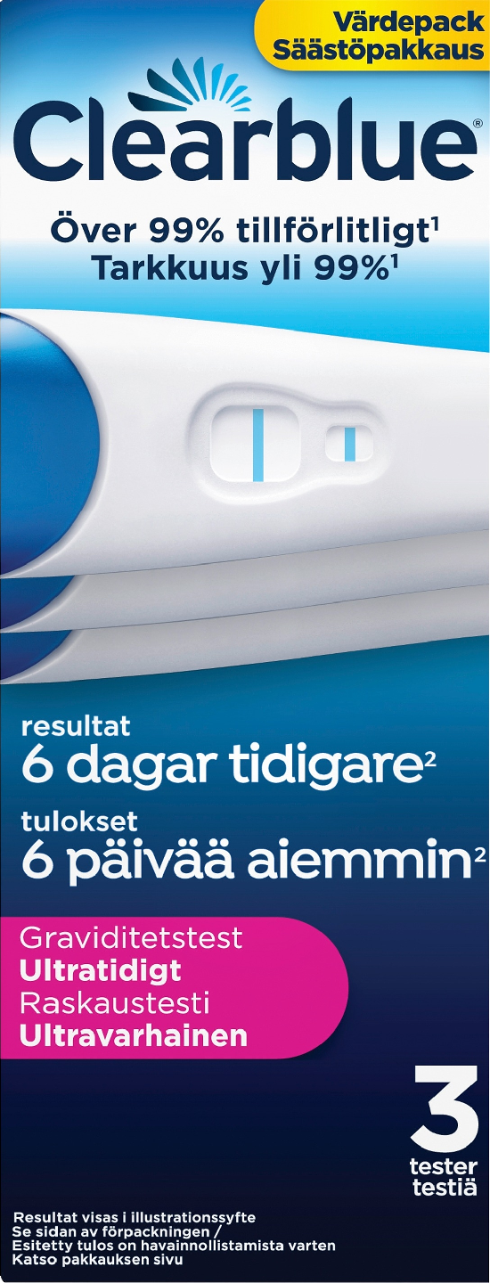 Clearblue ultravarhainen tulos -raskaustesti antaa tulokset 6 päivää ennen kuukautisten väliinjäämistä (eli 5 päivää ennen kuukautisten oletettua alkamispäivää) (1). Clearblue ultravarhainen tulos on kaikkein herkin raskaustestimme (10 mIU/ml) – mikään testi ei voi antaa tulosta aikaisemmin. Tarkkuus yli 99 % kuukautisten oletetusta alkamispäivästä alkaen. Lisätietoa tuotteesta ja vastauksia kysymyksiisi saat Clearblue-tuoteneuvonnasta ma–pe 10–13, paitsi pyhäpäivinä.