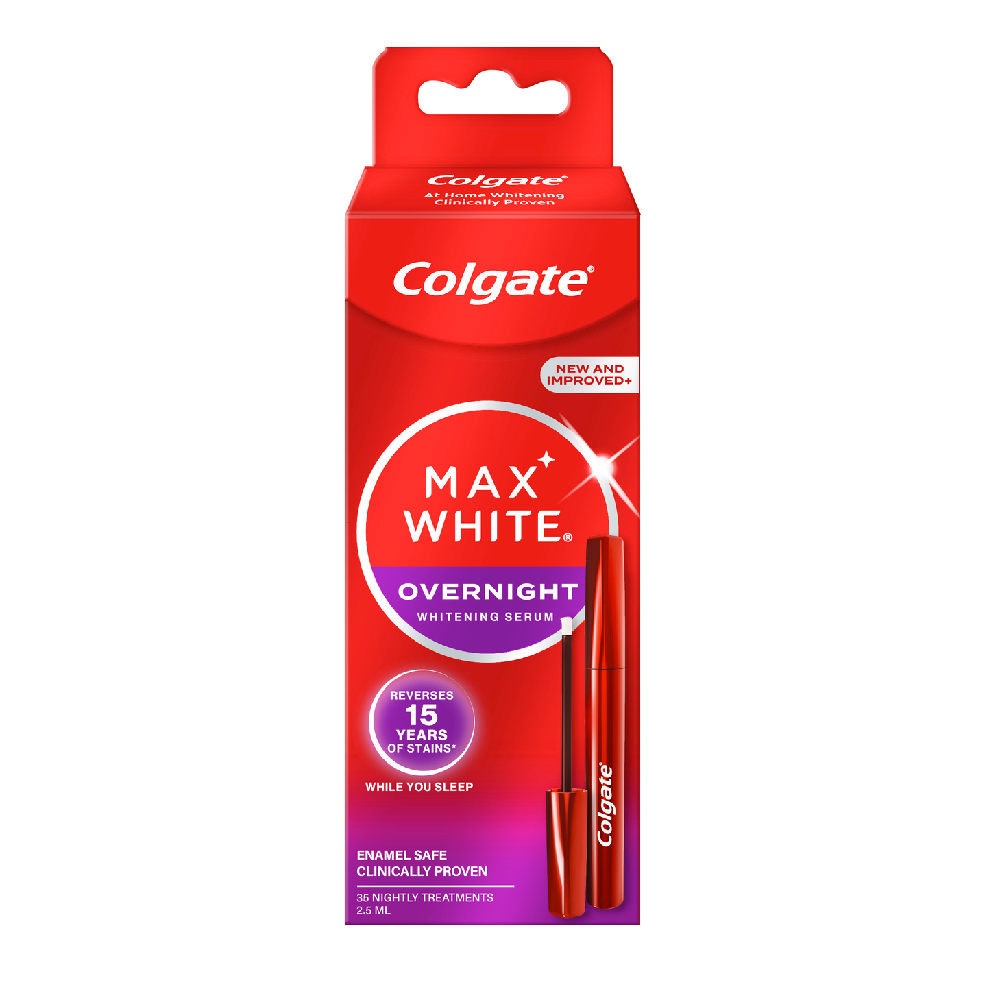 Max White Overnight -valkaiseva seerumi on turvallinen hammaskiilteelle, kuivuu hammaspinnoille nopeasti ja alkaa vaikuttaa ensimmäisestä käyttökerrasta. Dramaattisimmat tulokset saat käyttämällä Max White Overnight valkaisukynää yhdessä tehokkaan Colgate Max White Ultimate valkaisevan hammastahnan ja Colgate Max White Ultimate LED -valkaisulaitteen kanssa, joka tehostaa valkaisevan seerumin toimintaa jo vain 10 minuutin käytöllä.