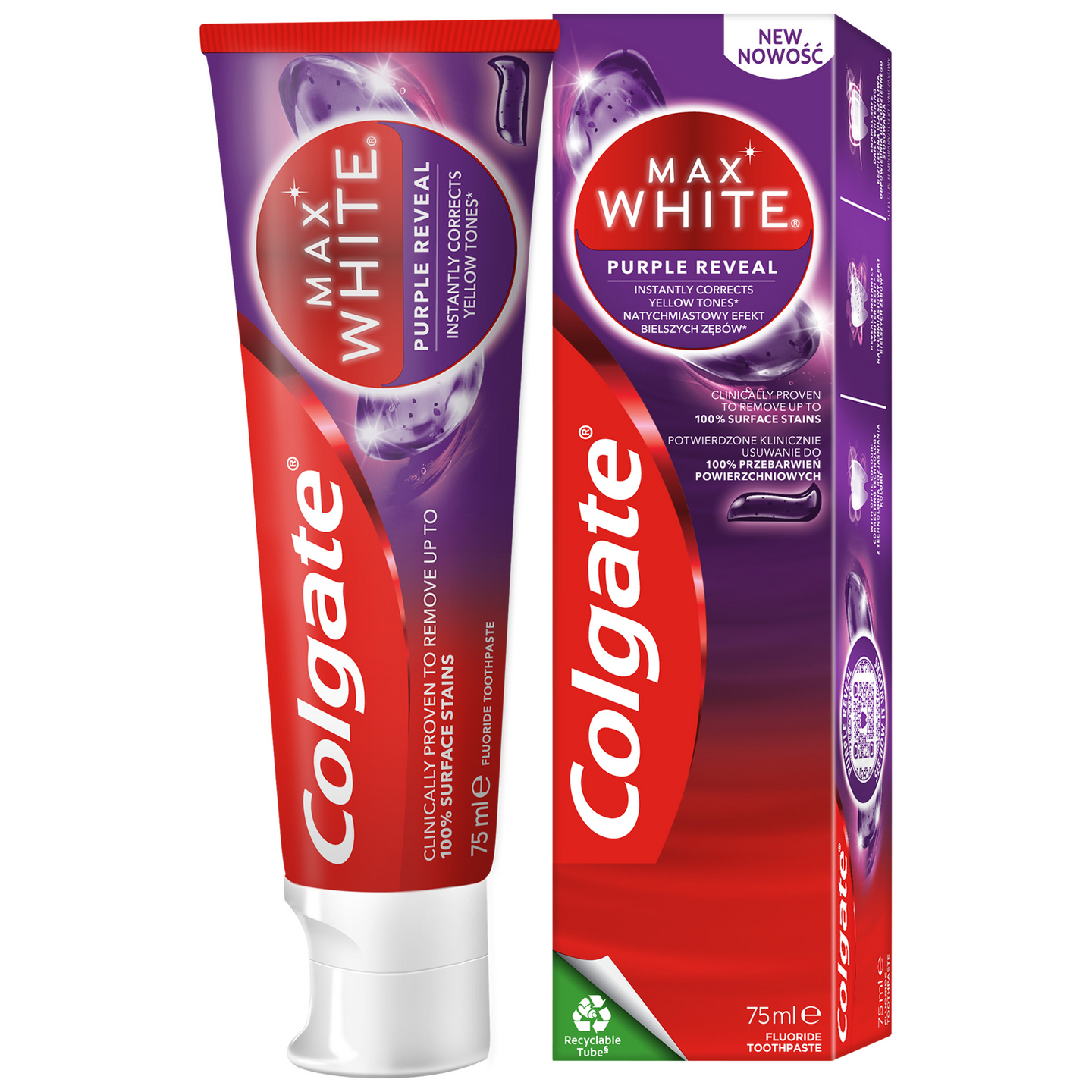 Tutustu Colgaten ensimmäiseen väriä korjaavaan purppura hammastahnaan, jonka optinen teknologia korjaa välittömästi* keltaisia sävyjä hampaista. Jatkuvassa käytössä, Colgate Max White Purple Reveal valkaiseva hammastahnan on kliinisesti todistettu myös poistavan jopa 100% hampaiden pintavärjäytymistä**, ja se sopii päivittäiseen käyttöön. Tämä väriä korjaava purppura hammastahna sisältää suositellun määrän fluoria, joten hampaasi saavat myös suojaa reikiintymiseltä.
