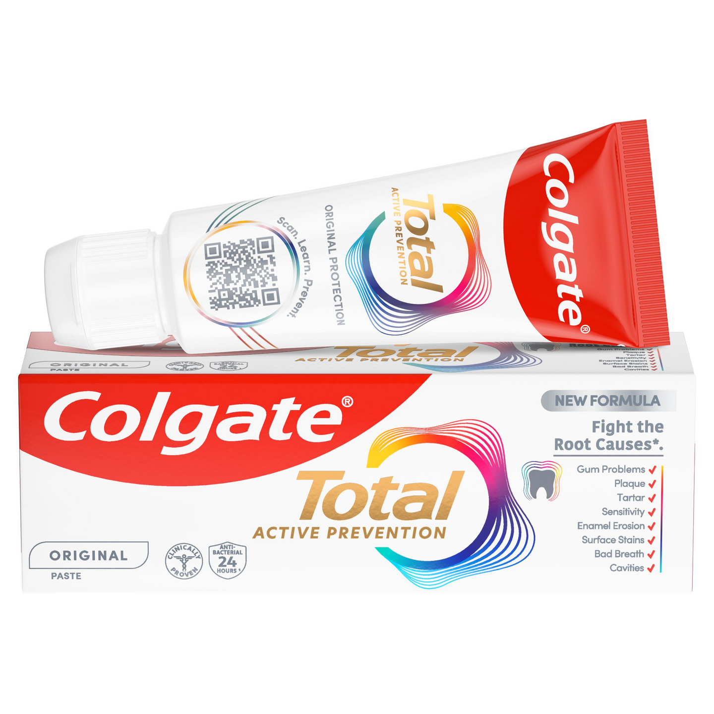 Suun terveydestä huolehtiminen ja sen suojelu alkaa jo ennen suun terveysongelmien ilmenemistä. Siksi Colgate Total Original -hammastahnan uusi koostumus on tieteellisesti suunniteltu ennaltaehkäisemään suun terveysongelmia³ taistelemalla niiden yleisimpiä aiheuttajia* vastaan. Colgate Total Original -hammastahna tarjoaa 24h antibakteerista¹ suojaa, ja sen ainutlaatuinen² yhdistelmä ainesosia stabiloi aktiivista suojaa antavan ainesosan, ja niin se tekee Colgate Total Original -hammastahnan koostumuksesta erityisen tehokkaan⁴.