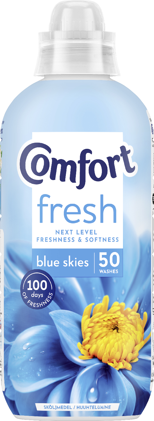 Comfort Blue skies-huuhteluaineessa on annos ulkoilman taikaa. Voit nauttia raikkaudesta sekä kaikkia Comfort-tuotteita yhdistävästä ihanan pehmeästä lopputuloksesta. Comfort Blue skies -huuhteluaine on täydellinen valinta sinulle, jolle pyykin pehmeys ja raikkaus sekä pitkäkestoinen puhdas tuoksu ovat tärkeitä. Kun vaatteet tuoksuvat hyvältä, tunnet olosi miellyttäväksi koko päivän. Käytä Comfort Blue -huuhteluainetta ja saat pitkäkestoista tuoksua, raikkautta ja pehmeyttä pyykillesi. Comfort Blue skies -huuhteluaineessa on luonnollinen ja raikas vihreän omenan, ruusun ja santelipuun mieto tuoksu. Tuntuu kuin olisit aina raittiissa ulkoilmassa. Ihana raikkaus kestää pitkään.